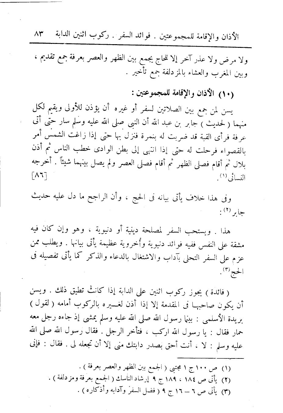 يسن لمن جمع بين الصلاتين لسفر أو غيره أن يؤذن للأولى ويقيم لكل منهما (لحديث) جابر بن عبد الله أن النبى صلى الله عليه وسلم سار حتى أتى عرفة رأى القبة قد ضربت له بنمرة فنزل بها حتى إذا زاغت الشمس أمر بالقصواء فرحلت له حتى إذا انتهى إلى بطن الوادى خطب الناس ثم أذن بلال ثم أقام فصلى الظهر ثم أقام فصلى الظهر ثم أقام فصلى العصر ولم يصل بينهما شيئاً. أخرجه النسائى (¬1). [86].