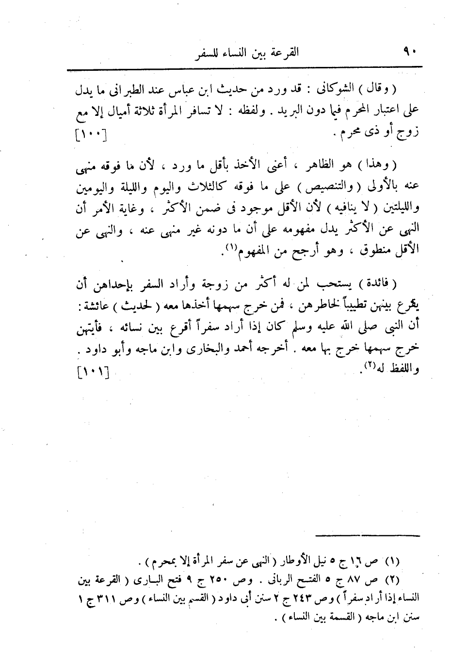 (¬2) ص 87 ج 5 الفتح الربانى. وص 250 ج 9 فتح البارى (القرعة بين النساء إذا أراد سفراً) وص 243 ج 2 سنن أبى داود (القسم بين النساء) وص 311 ج 1 سنن ابن ماجه (القسمة بين النساء) وص 311 ج 1 سنن ابن ماجه (القسمة بين النساء).