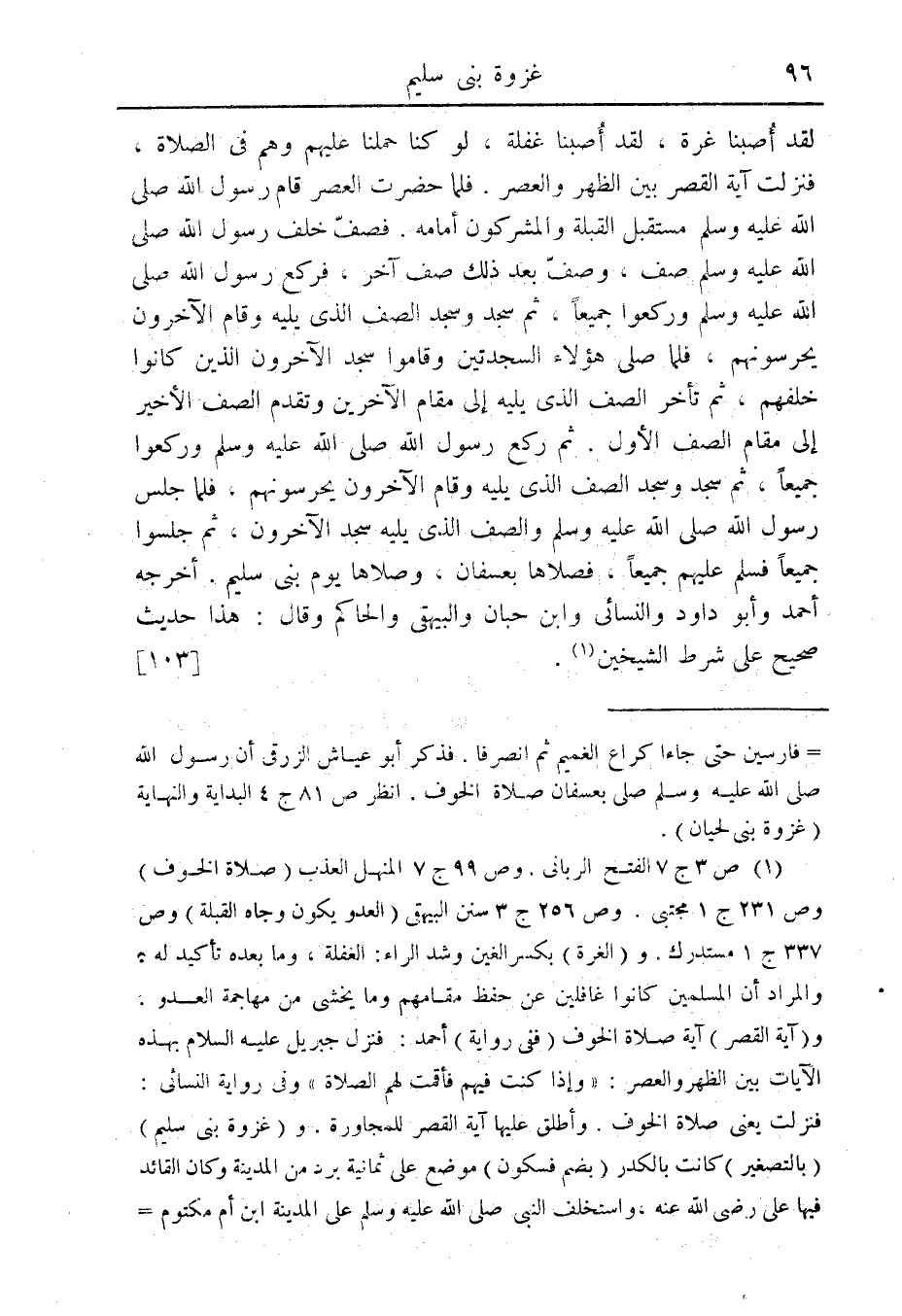 فنزلت يعنى صلاة الخوف. وأطلق عليها ىية القصر للمجاورة. و (غزوة بنى سليم) (بالتصغير) كانت بالكدر (بضم فسكون) موضع على ثمانية برد من المدنية وكان القائد فيها على رضى الله عنه، واستخلف النبى صلى الله عليه وسلم على المدينة ابن أم مكتوم وغنم فيها خمسمائة بعير، فقسم أربعمائة على المجاهدين، فخص كل واحد بعيران، وأخذ النبى صلى الله عليه وسلم مائة. أفاده فى بهجة المحافل (ومنه) تعلم أن " ما فى بعض" كتب التاريخ من أنه صلى الله عليه وسلم خرج إلى بنى سليم فى ثلثمائة رجل من أصحابه فوجدهم قد تفرقوا فى مياههم ولم يلق كيداً. أهـ " غير صحيح" والحديث صريح فى أن النبى صلى الله عليه وسلم صلى صلاة الخوف بعسفان ثم أن فى أرض سليم. ولا يعارضه ما قيل إن غزوة بنى سليم كانت قبل أحد ولم تكن شرعت صلاة الخوف يومئذ، لاحتمال أن النبى صلى الله عليه وسلم غزا بنى سليم مرتين: مرة قبل أحد ولم يصل فيها صلاة الخوف، ومرة بعد عسفان وصلى بها صلاة الخوف.