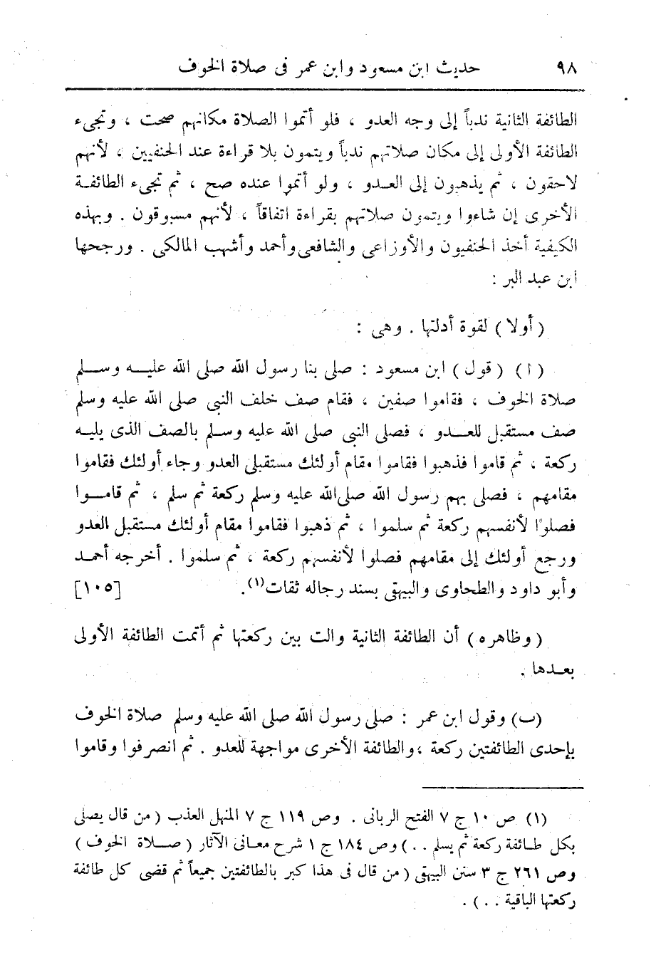 (¬1) ص 10 ج 7 الفتح الربانى. وص 119 ج 7 المنهل العذب (من قال يصلى بكل طائفة ركعة ثم يسلم .. ) وص 184 ج 1 شرح معانى الآثار (صلاة الخوف) وص 261 ج 3 سنن البيهقى (من قال فى هذا كبر بالطائفتين جميعاً ثم قضى كل طائفة ركعتها الباقية .. ).