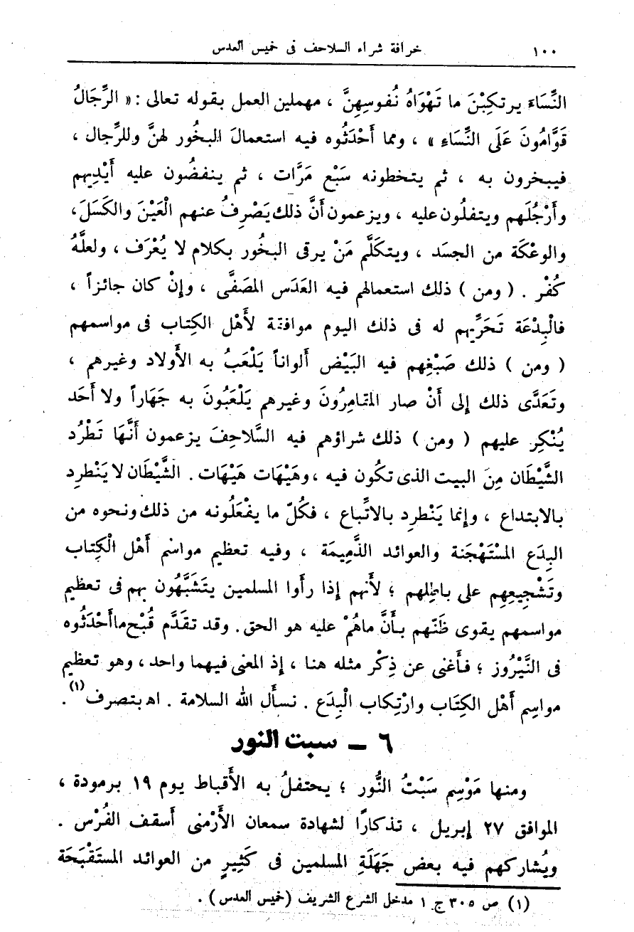 (ومن) ذلك استعمالهم فيه العَدَس المصَفَّى، وإِنْ كان جائزاً، فالْبِدْعَة تَحَرِّيهم له فى ذلك اليوم أَلواناً يَلْعَبُ به الأَولاد وغيرهم، وتَعَدَّى ذلك إِلى أَنْ صر المقامِرُونَ وغيرهم يَلْعَبُونَ به جَهَاراً ولا أَحَد يُنْكِر عليهم (ومن) ذلك شراؤهم فيه السَّلاحِفَ يزعمون أَنَّهَا تَطْرُد بالابتداع، وإِنما يَنْطرِد بالاِّتباع، فكُلّ ما يفْعَلُونه من ذلك ونحوه من البِدَع المسْتَهْجَنة والعوائد الذَّمِيمَة، وفيه تعظيم مواسم أَهْل الْكتِاب وتَشْجِيعِهِم على باطِلهم، لأَنهم إِذا رأَوا المسلمين يتَشَبَّهُون بهم فى تعظيم مواسمهم يقوى ظَنّهم بأَنَّ ما هُمْ عليه هو الحق. وقد تقَدَّم قُبْح ما أَحْدَثُوه فى النَّيْرُوز، فأَغنى عن ذِكْر مثله هنا، إِذ المعنى فيهما واحد، وهو تعظيم مواسِم أَهْل الكِتَاب وارْتِكاب الْبِدَع. نسأَل الله السلامة. اهـ بتصرف (¬1).
