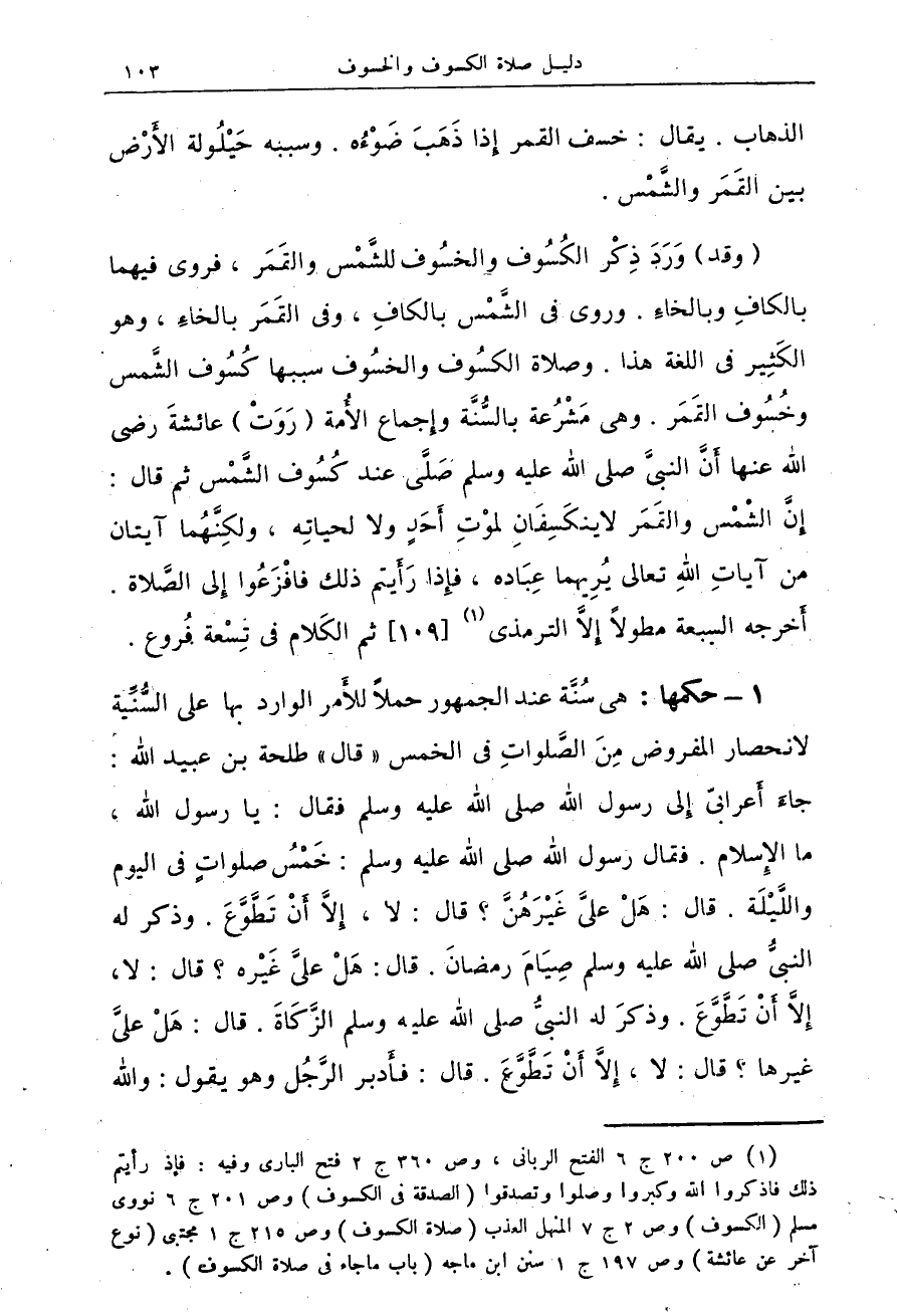 (وقد) وَرَدَ ذِكْر الكُسُوف والخسُوف للشَّمْس والقَمَر، فروى فيهما بالكافِ وبالخاءِ. وروى فى الشَّمْس بالكافِ وفى القَمَر بالخاءِ، وهو الكَثِير فى اللغة هذا. وصلاة الكسُوف سببها كُسُوف الشَّمس وخُسُوف القَمَر. وهى مَشْرُعة بالسُّنَّة وإِجماع الأُمة (رَوَتْ) عائشةَ رضى الله عنها أَنَّ النبىَّ صلى الله عليه وسلم صَلَّى عند كُسُوف الشَّمْس ثم قال: إِنَّ الشْمْس والقَمَر لا ينكَسِفَانِ لموْتِ أَحَدٍ ولا لحياتِه، ولكِنَّهُما آيتان من آياتِ اللهِ تعاى يُرِيهما عِبَاده، فإِذا رَأَيتم ذلك فافْزَعُوا إِلى الصَّلاة أَخرجه السبعة مطولاً إِلاَّ الترمذى (¬1) {109} ثم الكَلام فىتِسْعة فرُوع.