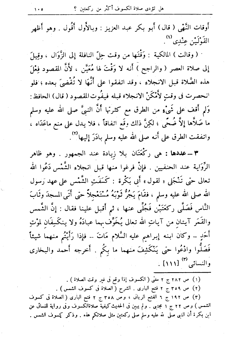 3 - عددها: هى ركْعَتَان بلا زِيادة عند الجمهور. وهو ظاهر الرِّوَاية عند الحنفيين. فإِنْ فرغوا منها قبل انجلاءِ الشَّمْس دَعُوا الله تعالى حتى تَنْجِلى " لقول " أَبى بَكْرة: كَسَفَتِ الشَّمْس على عهد رسول الله صلى الله عليه وسلم، فقَامَ يَجُرُّ ثَوْبَهُ مُسْتَعْجِلاً حتى أَتَى المسجدَ وثَابَ النَّاس فَصَلَّ ركعَتَيْن فَجُلِّى عنها، ثم أَقبل علينا فقال: إِنَّ الشَّمس والقَمَر آيتانِ من آياتِ الله تعالى يُخَوِّف بهما عبادَهُ ولا ينكَسِفَانِ لموْتِ أَحَدٍ - وكان ابنه إِبراهيم عليه السَّلام مَاتَ - فإِذا رَأَيْتُم منهما شيئاً فَضَلُّوا وادْعُوا حتى إِبراهيم يَنْكَشِفَ منهما ما بِكُم. أَخرجه أَحمد والبخارى والنسائى (¬3) {111}.