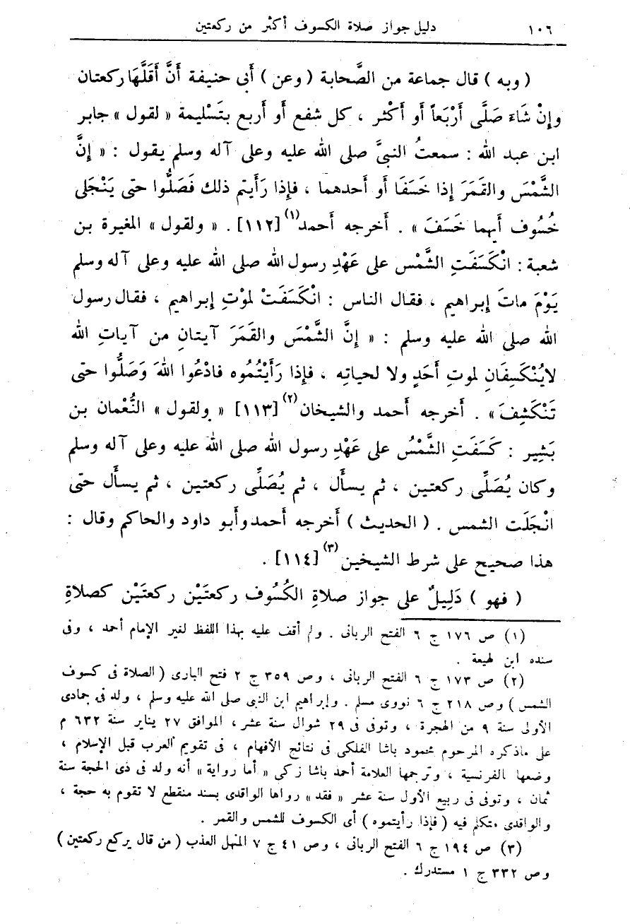 (¬2) ص 173 ج 6 الفتح الربانى، وص 359 ج 2 فتح البارى (الصلاة فى كسوف الشمس) وص 218 ج 6 نووى مسلم. وإبراهيم ابن النبى صلى الله عليه وسلم، ولد فى جمادى الأولى سنة 9 من الهجرة، وتوفى فى 29 شوال سنة عشر، الموافق 27 يناير سنة 632 م على ما ذكره المرحوم محمود باشا الفلكى فى نتائج الأفهام، فى تقويم العرب قبل الإسلام، وضعها الفرنسية، وترجمها العلامة أحمد باشا زكى " أما رواية " أنه ولد فى ذى الحجة سنة ثمان، وتوفى فى ربيع الأول سنة عشر " فقد " رواها الواقدى بسند منقطع لا تقوم به حجة، والواقدى متكلم فيه (فإذا رأيتموه) أى الكسوف للشمس والقمر.
