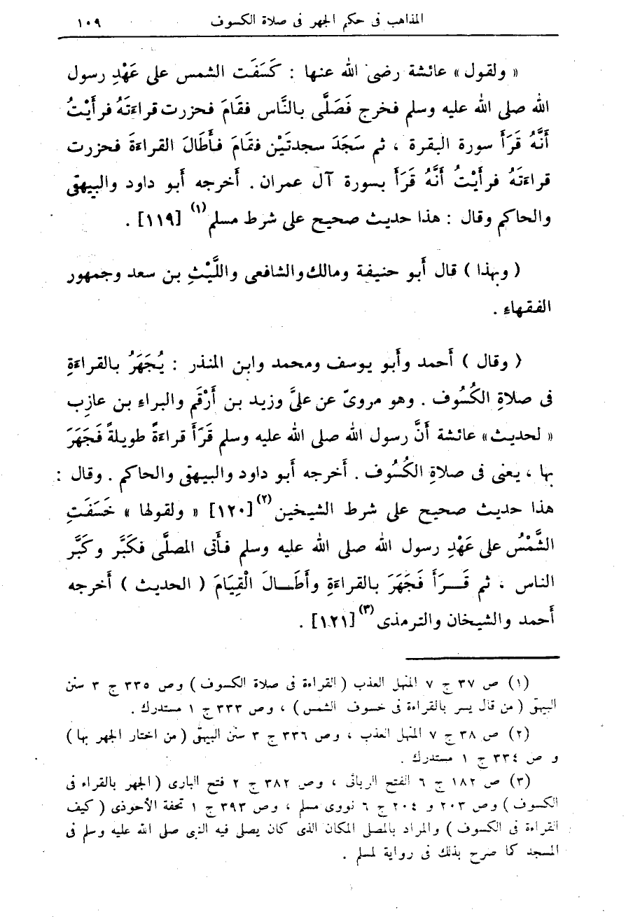 (¬1) ص 37 ج 7 المنهل العذب (القراءة فى صلاة الكسوف) وص 335 ج 3 سنن البيهقى (من قال يسر بالقراءة فى خسوف الشمس)، وص 333 ج 1 مستدرك.