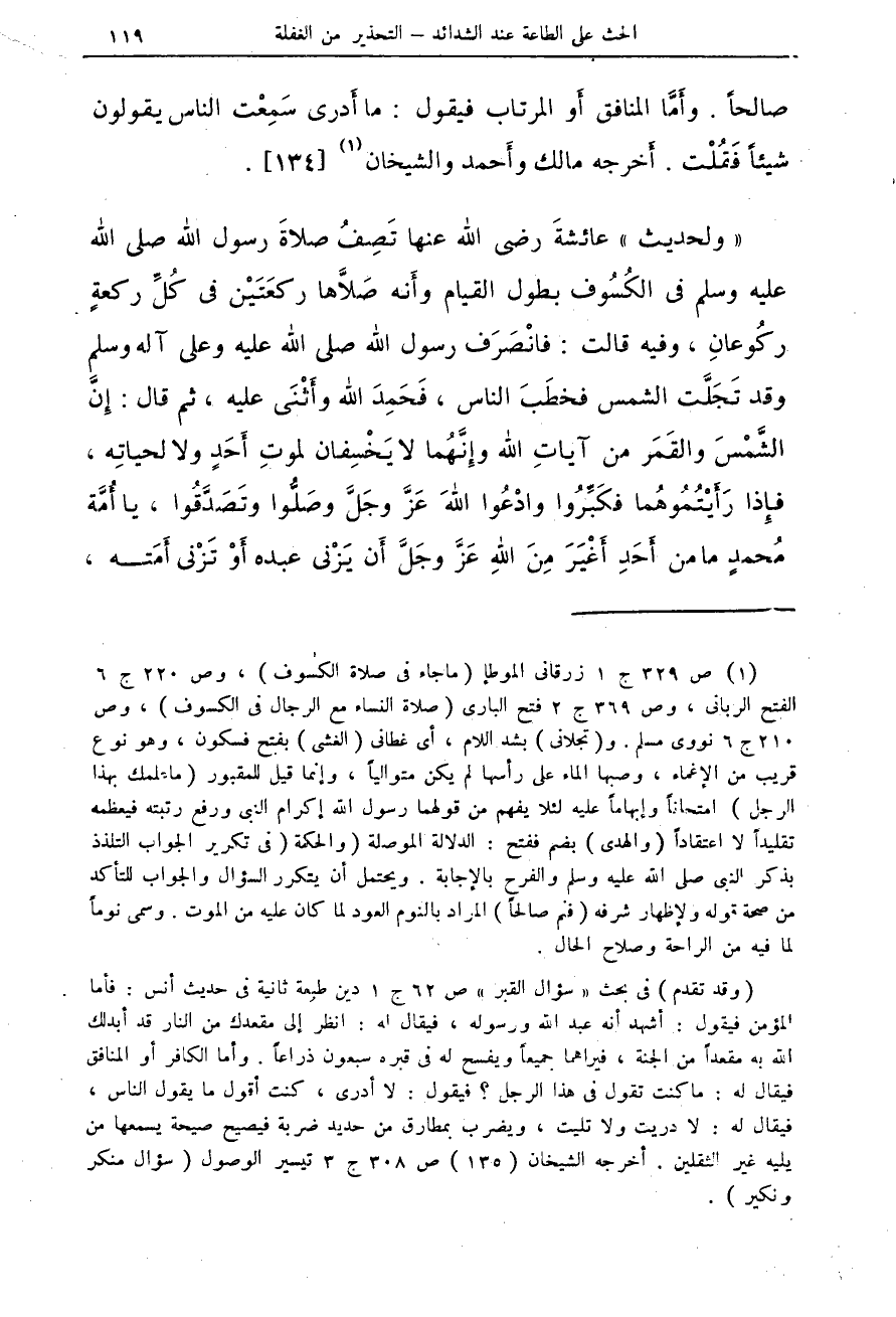 (¬1) ص 329 ج 1 زرقانى الموطإ (ما جاء فى صلاة الكسوف)، وص 220 ج 6 الفتح اربانى، وص 369 ج 2 فتح البارى (صلاة النساء مع الرجال فى الكسوف)، وص 210 ج 6 نووى مسلم .. و (تجلانى) بشد اللام، أى غطانى (الغشى) بفتح فسكون، وهو نوع قريب من الإغما، وصبها الماء على رأها لم يكن متوالياً، وإنما قيل للمقبور (ما علمك بهذا الرجل) امتحاناً وإبهاماً عليه لئلا يفهم من قولهما رسول الله إكرام النبى ورفع رتبته فيعظمه تقليداً لا اعتقاداً (والهدى) بضم ففتح: الدلالة الموصلة (والحكمة (فى تكرير الجواب التلذذ بذكر النبى صلى الله عليه وسلم والفرح بالإجابة. ويحتمل أن يتكرر السؤال والجواب للتأكد من صحة قوله ولإظهار شرفه (فنم صالحاً) المراد بالنوم العود لما كان ليه من الموت. وسمى نوماً لما فيه من الراحة وصلح الحال.