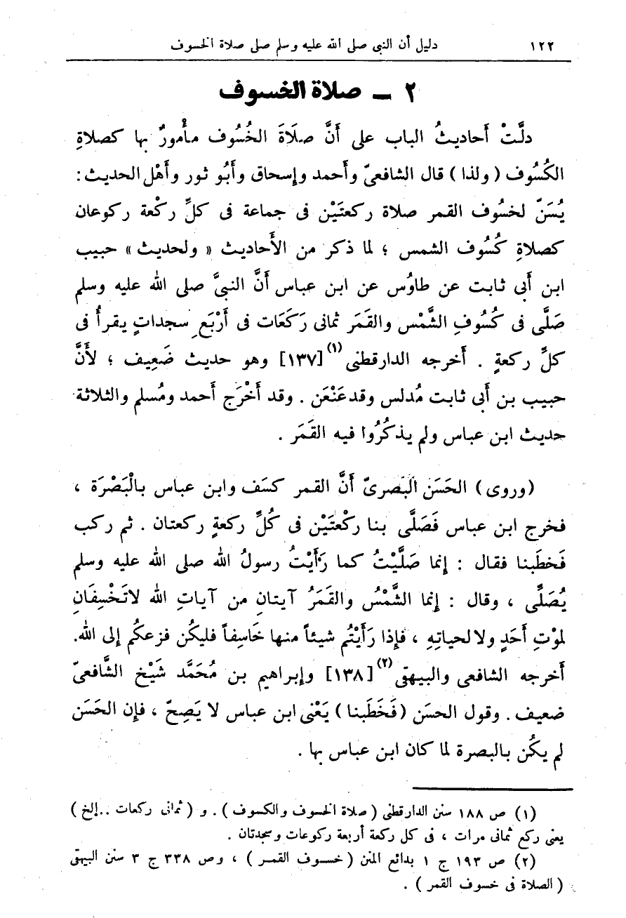 (¬1) ص 188 سنن الدارقطنى (صلاة الخسوف والكسوف). و (ثمانى ركعات .. إلخ) يعنى ركع ثمانى مرات، فى كل ركعة أربعة ركوعات وسجدتان.