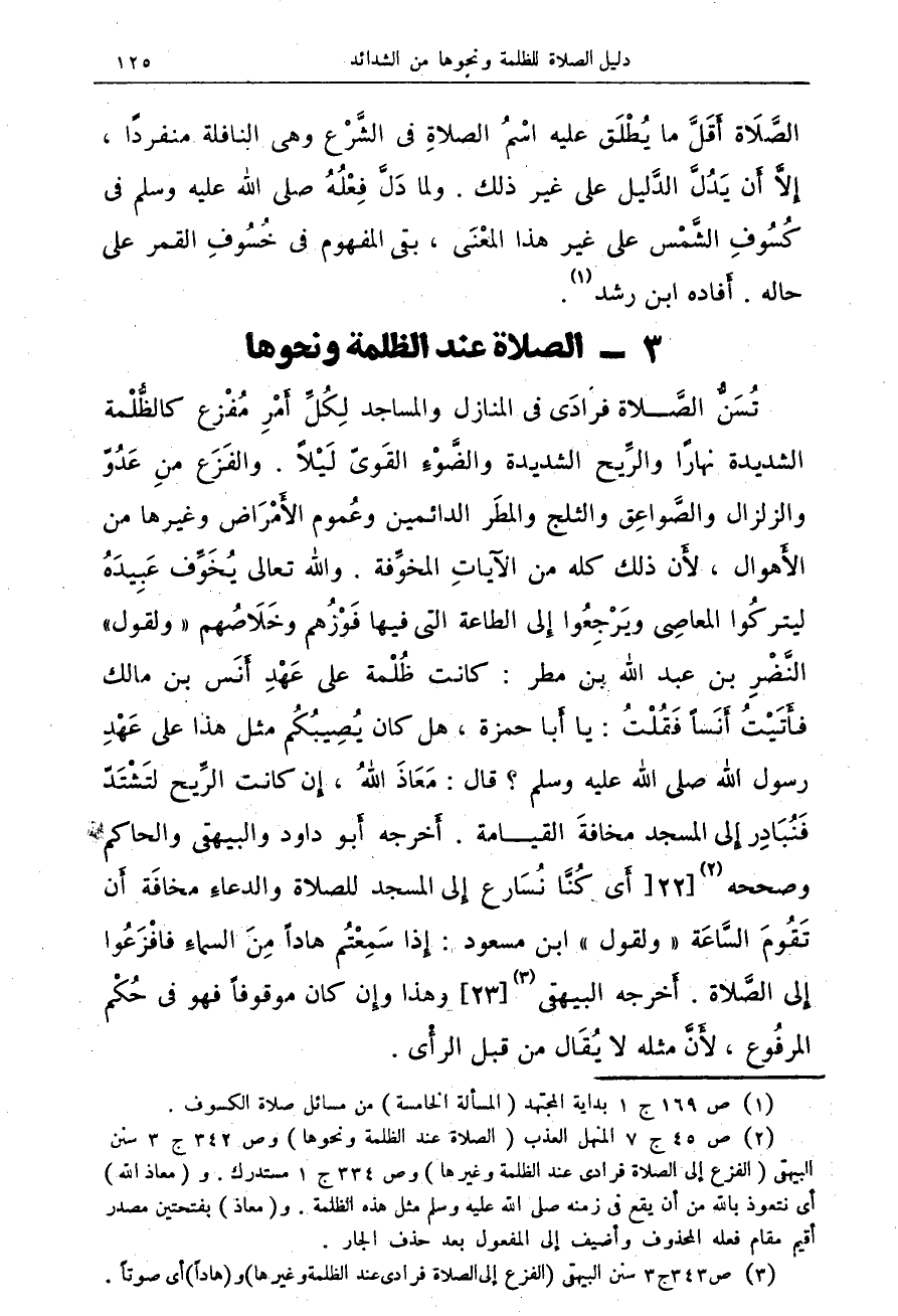 تُسَنُّ الصَّلاة فرادَى فى المنازل والمساجد لِكُلِّ أَمْرِ مُفْزع كالظُّلْمة الشديدة نهارًا والرِّيح الشديدة والضَّوْءِ اقَوىّ لَيْلاً. والفَزَع منِ عَدُوّ والزلزال والصَّواعِق والثلج والمطَر الدائمين وعَموم الأَمْرَاض وغيرها من الأَهوال، لأَن ذلك كله من الآياتِ المخوِّفة. والله تعالى يُحَوَّف عَبِيدَهُ ليتركُوا المعاصِى ويَرْجِعُوا إِلى الطاعة التى فيها فَوْزُهم وخَلآصهم" ولقول " النَّضْرِ بن عبد الله بن مطر: كانت ظُلْمة على عَهْدِ أَنَس بن مالك فأَتَيْتُ أَنَساً فَقُلْتُ: يا أَبا حمزة، هل كان يُصِيبُكُم مثل هذا على عَهْدِ رسول الله صلى الله عليه وسل؟ قال: مَعَاذَ اللهُ، إِن كانت الرِّيح لتَشْتَدّ فَتُبَادِ إِلى المسجد مخافةَ القيامة. أَخرجه أَبو داود والبيهقى والحاكم وصححه (¬2) {22} أى كُنَّا نُسَارع إِلى المسجد للصلاة الدعاءِ مخافَة أَن تَقُومَ السَّاعَة " ولقول " ابن مسعود: إِذا سَمِعْتُم هاداً مِنَ السماءِ فافْزَعُوا إِلى الصَّلاة. أَخرجه البيهقى (¬3) {23} وهذا وإن كان موقوفاً فهو فى حُكْم المرفُوع، لأَنَّ لا يُقَال من قبل الرأْى.