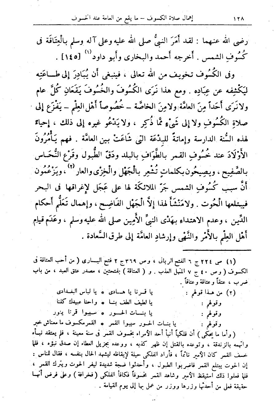 وفى الكُسُوف تخويف من الله تعالى، فينبغى أَن يُبَادِرَ إِلى طاعَتِه ليَكْشِفه عن عِبَادِه. ومع هذا نَرَى الكَسُوفَ والخُسُوفَ يَقَعَانِ كُلَّ عام ولا نَرَى أَحَداً مِنَ العامَّة ولا مِنَ ذُكِر، ولا يَدْعُو غيره إِلى ذلك، إِحياءً لهذه السُّنة الدارسة وإِماتةً للبِدْعَه التى شَاعَتْ بين العامَّة. فهم يَأْمُرُونَ الأَوْلآدَ عند خُسُوفِ القمر بالطَّوافِ بالبلد ودَقّ الطُّبول وقَرْع النُّحاس بالصُّفِيح، ويصِيحُون بكلماتٍ تُشْعِر بالْجَهْل والْخِزْى والعار (¬2)، ويَزْعُمُون أَنَّ سبب كُسُوفِ الشمس جَرّ الملائكَة لها على عَجَل لإِغراقها فى البحر فيبتلعها الْحُوت. ولا مَنْشَأَ لهذا إِلاَّ الْجَهْل الفَضِح، وإِهمال تَعَلُّم أَحكام الدَّين، وعدم الاهتداءِ بهَدْى النبىِّ الأَمِين صلى الله عليه وسلم، وعَدَم قيام أَهْل العِلْم بالأَمْر والنَّهْى وإِرشادِ لعامَّة إِلى طرق السَّعادة.