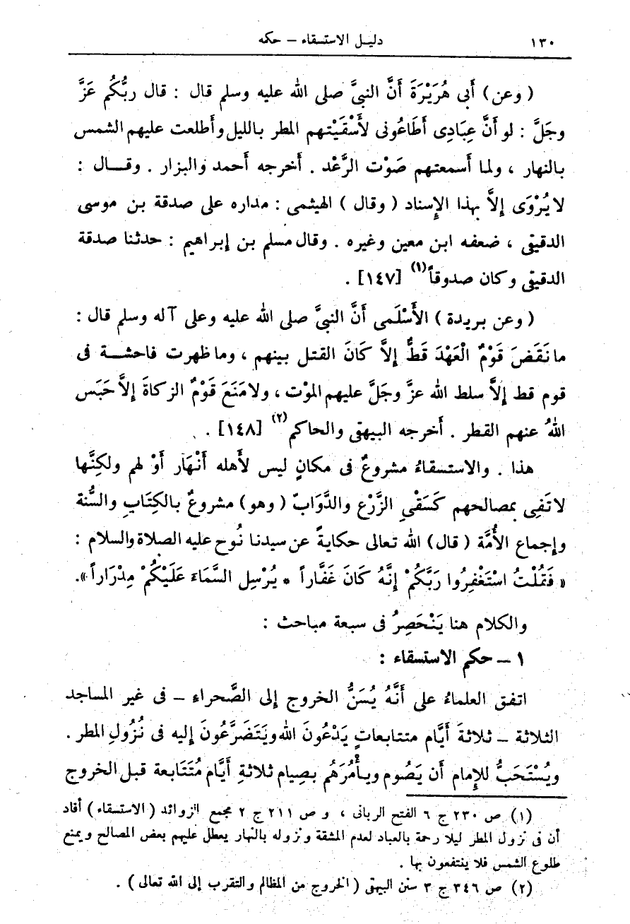 هذا. الاستسقاءُ مشروعٌ فى مكانٍ ليس لأَهله أَنْهَار أَوْ لهم ولكِنَّها لا تَفِى بمصالحهم كَسَقْىِ الزَّرْع والدَّوَابّ (وهو) مشروعٌ بالكِتَابِ والسُّنة وإِجماع الأُمَّة (قال) الله تعالى حكايةً عن سيدنا نُوح عليه الصلاة والسلام: " فَقُلْتُ اسْتَغْفِرُوا رَبَّكُمْ إِنَّهُ كَانَ غَفَّاراً * يُرْسِل السَّمَاءَ عَلَيْكُمْ مِدْرَاراً ".
