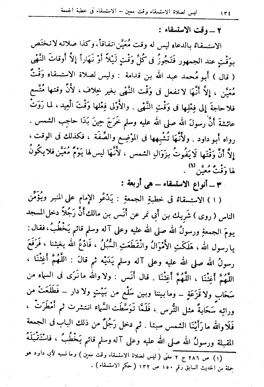 (ا) الاستسقاءُ فى خطبةِ الجمعةِ: يَدْعُو الإِمام على المنبر ويُؤَمِّن الناس (روى) شَرِيك بن أَبى نمر عن أَنَس بن مالك أَنَّ رَجُلاً دخل المسجد يومَ الجمعةِ ورسولُ الله صلى الله عليه وعلى آلأه وسلم قائم يَخْطُبُ، فقال: يا رسول الله، هَلَكَتِ الأَمْوَالُ وانْقَطَعَتِ السُّبُلُ، فَادْعُ الله يغيثنا، فَرَفَعَ رسولُ الله صلى الله عليه وعلى آله وسلم يَدَيْه ثم قالَ: اللَّهُمَّ أَغِثْنَا، اللَّهُمَّ أَغِثْنَا، اللَّهُمَّ أَغِثْنَا. قال أَنَس: ولا والله ما نَرَى فى السماءِ من سَحَابٍ ولا قَزَعَةٍ - وما بيننا وبين سَلْع من بَيْتٍ ولا دار - فَطَلَعَتْ من ورائِه سَحَابةٌ مثل التُّرس، فَلَمَّا تَوَسَّطَت السَّماءَ انتشرت ثم أَمْطَرَتْ، المقبلة ورسولُ الله صلى الله عليه وعلى آله وسلم قائم يَخْطُبُ، فاسْتَقْبَلَهُ