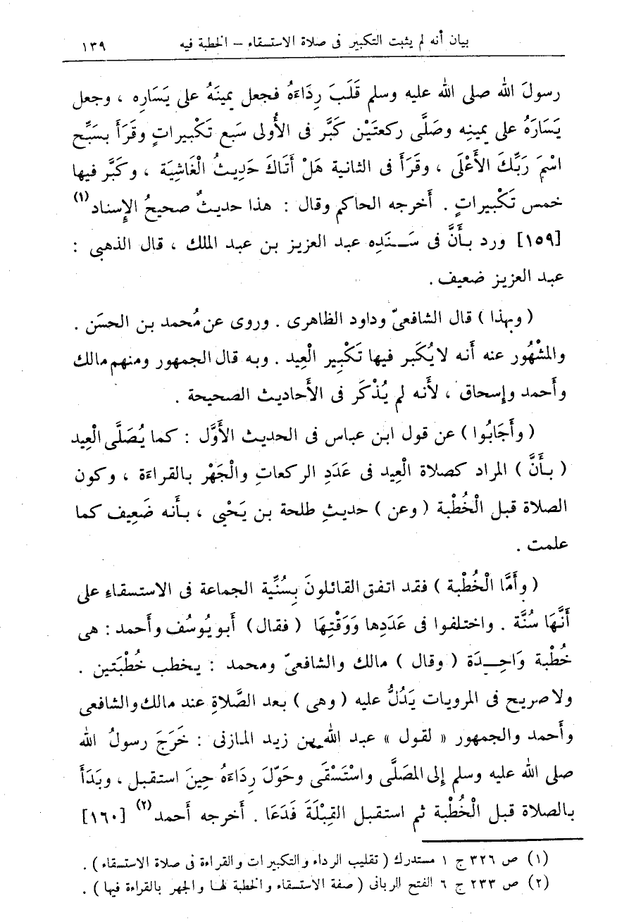 رسولَ الله صلى الله عليه وسلم قَلَبَ رِدَاءَهُ فجعل يمينَهُ على يَسَارِه، وجعل يَسَارَهُ على يمينِه وصَلَّى ركعتَيْن كَبَّر فى الأُولى سَبع تَكْبيراتٍ وقَرَاَ بسَبِّح اسْمَ رَبِّكَ الأَعْلَى، وقَرَاَ فى الثانية هَلْ أَتَاكَ حَدِيثُ الْغَاشِيَة، وكَبَّر فيها خمس تَكْبيراتٍ. أَخرجه الحاكم وقال: حديثٌ صحيحُ الإِسناد (¬1) {159} ورد بأَنَّ فى سَنَدهِ عبد العزيز بن عبد الملك، قال الذهبى: عبد العزيز ضعيف.