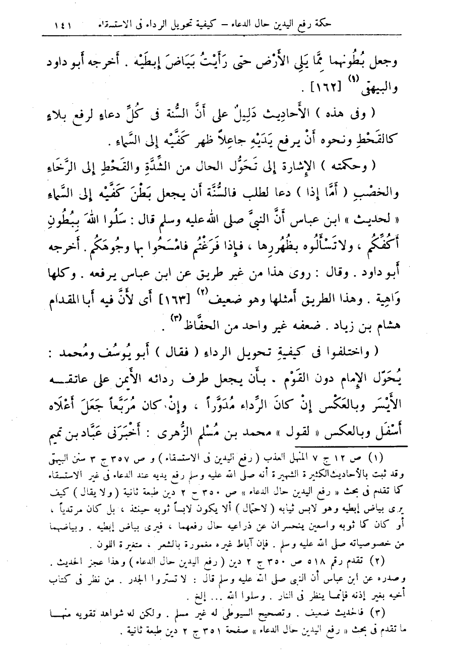 (وحكمته) الإِشارة إِلى تَحَوُّل الحال من الشِّدَّةِ والقَحْطِ إِلى الرَّخاءِ " لحديث " ابن عباس أَنَّ النبىَّ صلى الله عليه وسلم قال: سَلُوا اللهَ بِبُطُونِ أَكُفِّكُم، ولا تَسْأَلُوه بظُهُررِها، فإِذا فَرَغْتُم فامْسَحُوا بها وجُوهَكُم. أَخرجه أَبو داود. وقال: روى هذا من غير طريق عن ابن عباس يرفعه. وكلها وَاهِية. وهذا الطريق أَمثلها وهو ضعيف (¬2) {163} أَى لأَنَّ فيه أَبا المقدام هشام بن زياد. ضعفه غير واحد من الحفَّاظ (¬3).