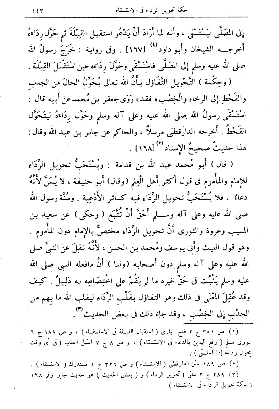 (¬1) ص 351 ج 2 فتح البارى (استقبال القبلة فى الاستسقاء)، وص 189 ج 6 نووى مسلم (رفع اليدين بالدعاء فى الاستسقاء)، وص 8 ج 7 المنهل العذب (فى أى وقت يحول رداءه إذا استسقى).