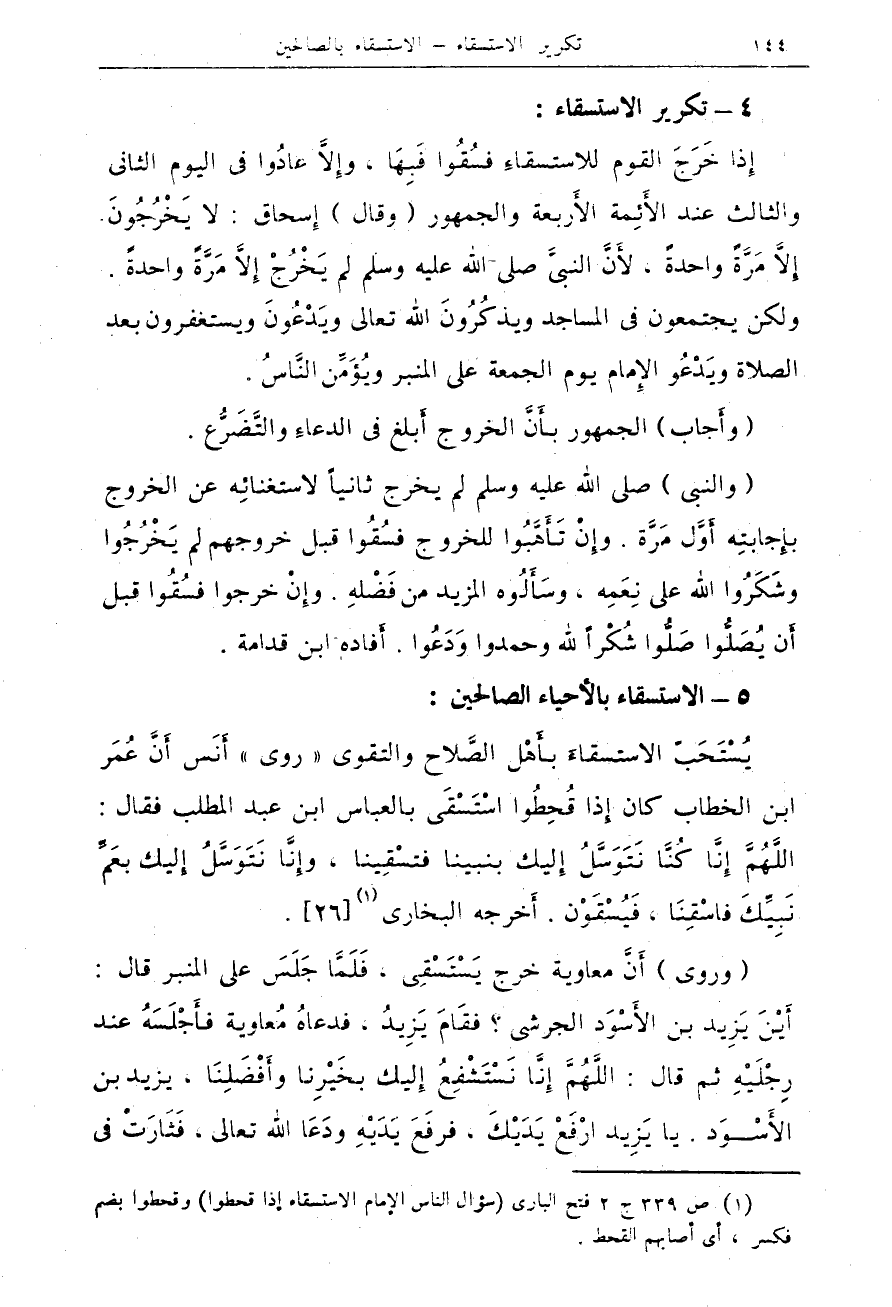 يُسْتَحَبّ الاستسقاءَ بأَهْل الصَّلاح والتقوى " روى " أَنَس أَنَّ عُمَر ابن الخطاب كان إِذا قُحِطُوا اسْتَسْقَى بالعباس ابن عبد المطلب فقال: اللَّهُمَّ إِنَّا كُنَّا نَتَوَسَّلُ إِليك بنبينا فتسْقِينا، وإِنَّا نَتَوَسَّلُ إِليك بعَمِّ نَبِيِّكَ فاسْقِنَا، فَيُسْقَوْن. أَخرجه البخارى (¬1) {26}.