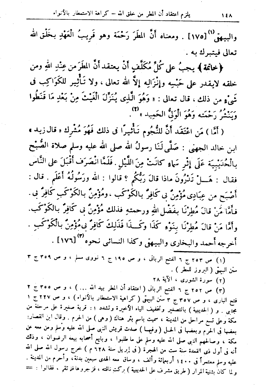 (أما) من اعتقد أن للنجوم تأثيراً في ذلك فهو مشرك "قال زيد" ابن خالد الجهني: صلى لنا رسول الله صلى الله عليه وسلم صلاة الصبح بالحديبية على إثرِ سماءٍ كانت من الليلِ. فلما انصرف أقبلَ على النَّاس فقال: هل تدرون ماذا قالَ ربكُم؟ قالوا: الله ورسولهُ أعلم. قال: أصبح من عبادي مؤمن بي كافر بالكوكب، ومؤمن بالكوكب كافرٌ بي. فأما من قال مطرنا بفضل الله ورحمته فذلك مؤمن بي كافرٌ بالكوكب. وأما من قال مطرنا بنوءٍ كذا وكذا فذلك كافرٌ بي مؤمنٌ بالكوكبِ. أخرجه أحمد والبخاري والبيهقي وكذا النسائي نحوه (¬3). [176]
