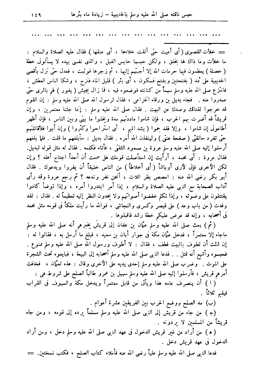 خلأت القصوى (أي أعيت حتى ألقت خلاءها، أي عنقها) فقال عليه الصلاة والسلام: ما خلأت وما ذاك لها بخلق، ولكن حبسها حابس الفيل، والذي نفسي بيده لا يسألوني خطة (خصلة) يعظمون فيها حرمات الله إلا أجبتهم اليها، ثم زجرها فوثبت، فعدل حي نزل بأقصى الحديبية على ثمد (بفتحتين وبفتح فسكون، أي بئر) قليل الماء فنزح، وشكا الناس العطش، فانتزع صلى الله عليه وسلم سهماً من كنانته فوضعوه فيه، فما زال يجيش (يفور) لهم بالري حتى صدروا عنه. فجاء بديل بن ورقاء الخزاعي، فقال لرسول الله صلى الله عليه وسلم: إن القوم قد خرجوا لقتالك وصدك عن البيت. فقال صلى الله عليه وسلم: إنما جئنا معتمرين، وإن قريشاً قد أضرت بهم الحرب، فإن شاءوا ماددتهم مدة ويخلوا ما بيني وبين الناس، فإن أظهر اطاعوني إن شاءوا، وإلا فقد جموا (بشد الميم، أي استراحوا وكثروا) وإن أبوا فلأقاتلنهم حتى تفرد سالقي (صفحة عنقي) ولينفذن الله أمره. فقال بديل: سأبلغهم ما قلت. فلما بلغهم أرسلوا اليه صلى الله عليه وسلم عروة بن مسعود الثقفي، فأتاه فكلمه. فقال له مثل قوله لبديل. فقال عروة: أي محمد، أرأيت إن استأصلت قومك هل سمعت أن أحداً اجتاح أهله؟ وإن تكن الاخرى فإني لأرى وباشاً (أي أخلاطاً) من الناس خليقاً أن يفروا ويدعوك. فقال ابو بكر رضي الله عنه: امصص بظر اللات، انحن نفر وندعه؟ ثم رجع عروة وقد رأى آداب الصحابة مع النبي صلى الله عليه الصلاة والسلام، إذا أمر ابتدروا أمره، واذا توضأ كادوا يقتتلون على وضوئه، واذا تكلم خفضوا أصواتهم ولا يحدون النظر اليه تعظيماً له. فقال: لقد وفدت (من باب وعد) على قيصر وكسرى والنجاشي، فوالله ما رأيت ملكاً في قومه مثل محمد في أصحابه، وإنه قد عرض عليكم خطة رشد فاقبلوها.