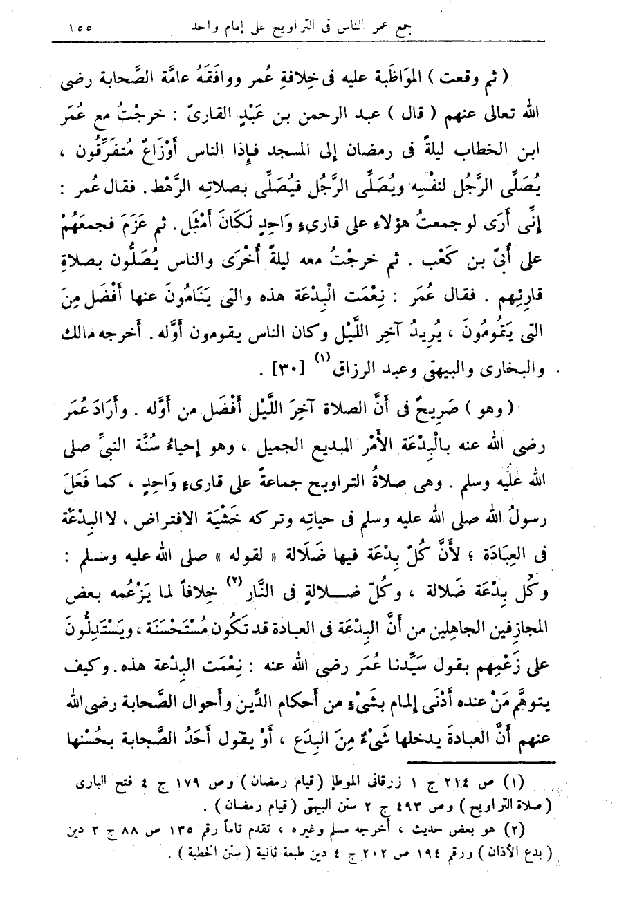 (ثم وقعت) المواظبة عليه في خلافةِ عُمر ووافَقَهُ عامَّة الصحابة رضي الله تعالى عنهم (قال) عبد الرحمن بن عَبْدٍ القاريّ: خرجتُ مع عُمَر ابن الخطاب ليلةً في رمضان إلى المسجد فإذا الناس أوزاعٌ متفرقون، يصلي الرجل لنفسه ويصلي الرجل فيصلي بصلاته الرهط. فقال عمر: إني أرى لو جمعت هؤلاء على قاريء واحدٍ لكان أمثل. ثم عزم فجمعهم على أبي بن كعب. ثم خرجت معه ليلة أخرى والناس يصلون بصلاةِ قارئِهم. فقال عمر: نِعْمَت البدعة هذه والتي ينامون عنها أفضل من التي يقومون، يريد آخر الليل وكان الناس يقومون أوله. أخرجه مالك والبخاري والبيهقي وعبد الرازق (¬1) {30}.