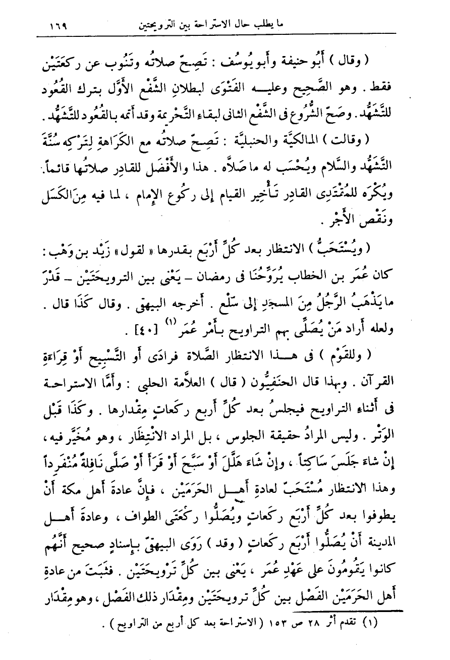 (وللقَوْم) فى هذا الانتظار الصَّلاة فرادَى أَو التَّسْبِيح أَوْ قِرَاءَةِ القرآن. وبهذا قال الحنَفِيُّون (قال) العلاَّمة الحلبى: وأَمَّا الاستراحة فى أَثناءِ التراويح فيجلسُ بعد كُلِّ أَربع ركَعات مِقْدارها. وكَذَا قَبْل الوَتْر. ولي المرادُ حقيقة الجلوس، بل المراد الانْتِظَار، وهو مُخَيَّر فيه، إِنْ شاءَ جَلَسَ سَاكِتاً، وإِنْ شَاءَ هَلَّلَ أَوْ سَبَّحَ أَوْ قَرَأَ أَوْ صَلَّى نَافِلةً مُنْفَرِداً وهذا الانتظار مُسْتَحَبً لعادةِ أَهل الحَرَمَيْن، فإِنَّ عادةَ أَهل مكة أَنْ يطوفوا بعد كُلِّ أَرْبَع ركَعاتٍ ويُصَلُّوا ركْعَتَى الطواف، وعادةَ أَهل المدنية أَنْ يُصَلُّوا أَرْبَع ركَعاتٍ (وقد) رَوَى البيهقىّ بإِسنادٍ صحيح أَنَّهُم كانوا يَقُومُون على عَهْدِ عُمَر، يَعْنى بين كُلِّ ترويحَتَيْن ومِقْدَار ذلك الفَصْل، وهو مِقْدَار