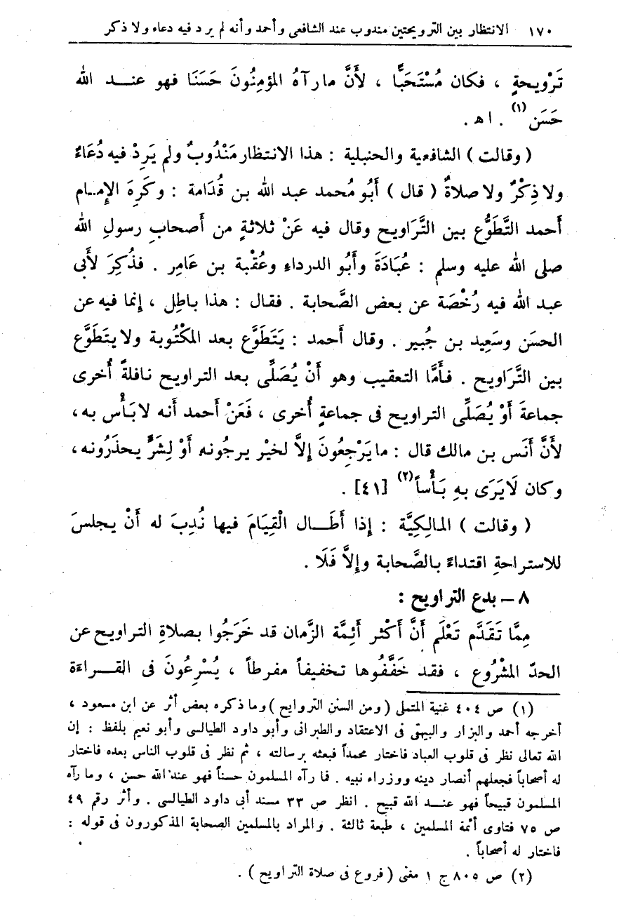 (وقالت) الشافعية والحنبلية: هذا الانتظار مَنْدُوبٌ ولم يَرِدْ فيه دُعَاءٌ ولا ذِكْرٌ ولا صلاةٌ (قال) أَبُو مُحمد عبد الله بن قُدَامة: وكَرِهَ الإِمام أحمد التَّطَوُّع بين التَّرَاويح وقال فيه عَنْ ثلاثةٍ من أَصحابِ رسولِ الله صلى الله عليه وسلم: عُبَادَةَ وأَبُو الدرداءِ وعُقْبة بن عَامِر. فذُكِرَ لأَبى عبد الله فيه رُخْصَة عن بعض الصَّحابة. فقال: هذا باطِل، إِنما فيه عن الحسَن وسَعِيد بن جُبير. وقال أَحمد: يَتَطَوَّع بعد المكْتُوبة ولا يتَطَوَّع بين التَّرَاويح. فأَمَّا التعقيب وهو أَنْ يُصَلِّى بعد التراويح نافلةً أُخرى جماعةَ أَوْ يُصَلِّى التراويح فى جماعةٍ أُخرى، فَعَنْ أَحمد أَنه لا بَأْس به، لأَنَّ أَنَس بن مالك قال: ما يَرْجِعُونَ إِلاَّ لخيْر يرجُونه أَوْ لِشَرٍّ يحذَرُونه، وكان لآيَرَى بهِ بَأْساً (¬2) {41}.