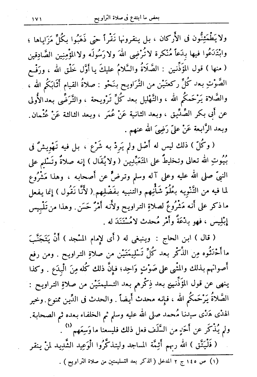 (¬1) ص 145 ج 2 المدخل (الذكر بعد التسليمتين من صلاة التراويح).