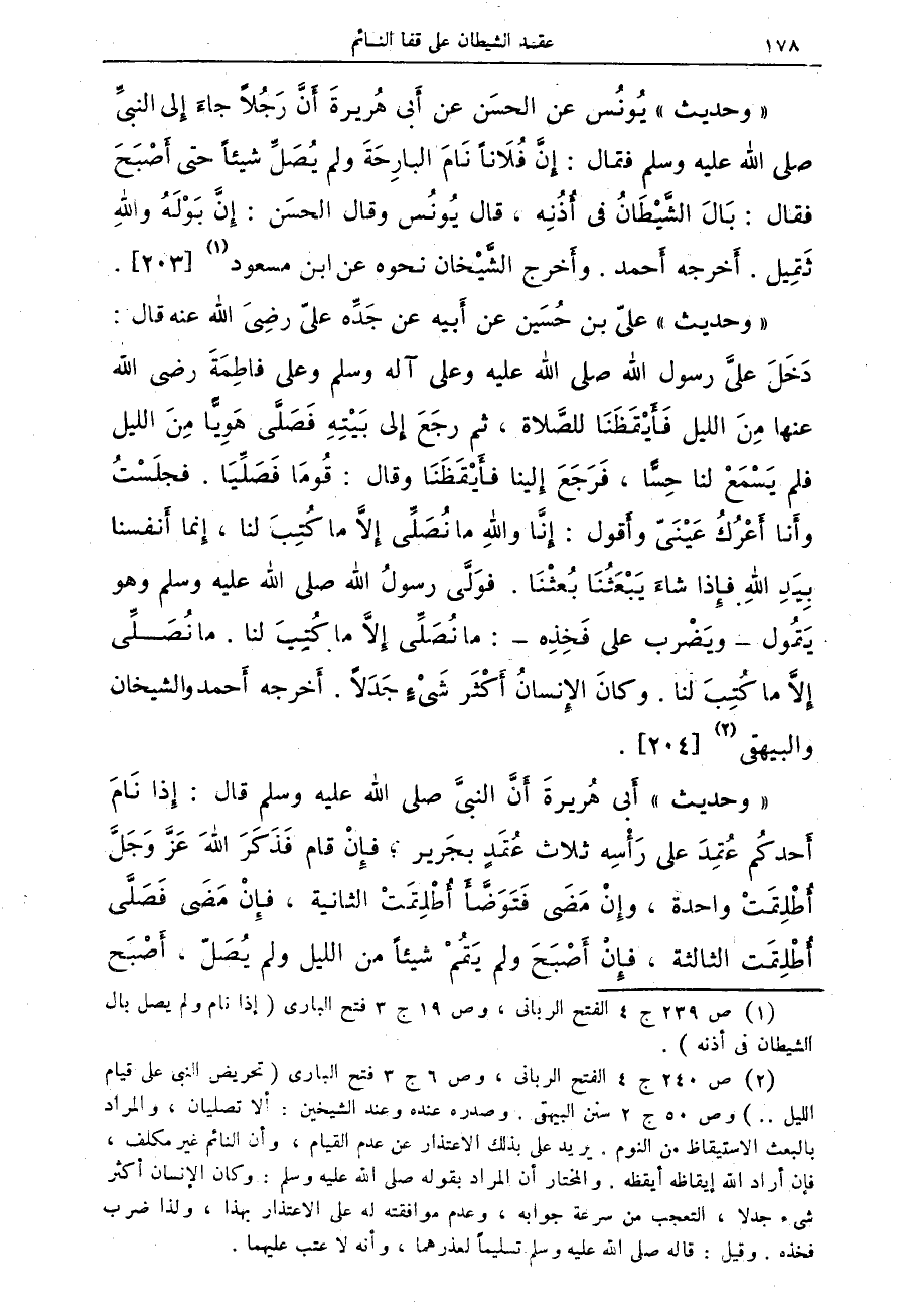 " وحديث " يُونُس عن الحسَن أَبى هُريرةَ أَنَّ رَجُلاً جاءَ إِلى النبىَّ صلى الله عليه وسلم فقال: إِنَّ فُلآناً نَامَ البارِحَةَ ولم يُصَلِّ شيئاً حتى أَصْبَحَ فقال: بَالَ الشَّيْطَانُ فى أُذُنِه، قال يُونُس وقال الحسَن: إِنَّ بَوْلَهُ واللهِ ثَقِيل. أَخرجه أَحمد. وأَخرج الشَّيْخان نحوه عن ابن مسعود (¬1) {203}.