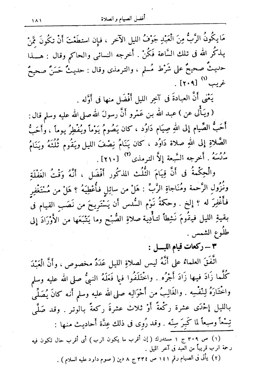 (ويأتي عن) عبد الله بن عمرو أن رسول الله صلى الله عليه وسلم قال: أحب الصيام إلى الله صيام داود، كان يصوم يوماً ويفطر يوماً، وأحب الصلاة إلى الله صلاة داود، كان ينام نصف الليل ويقوم ثلثه وينام سدسه. أخرجه السبعة إلا الترمذي (¬2) {210}.