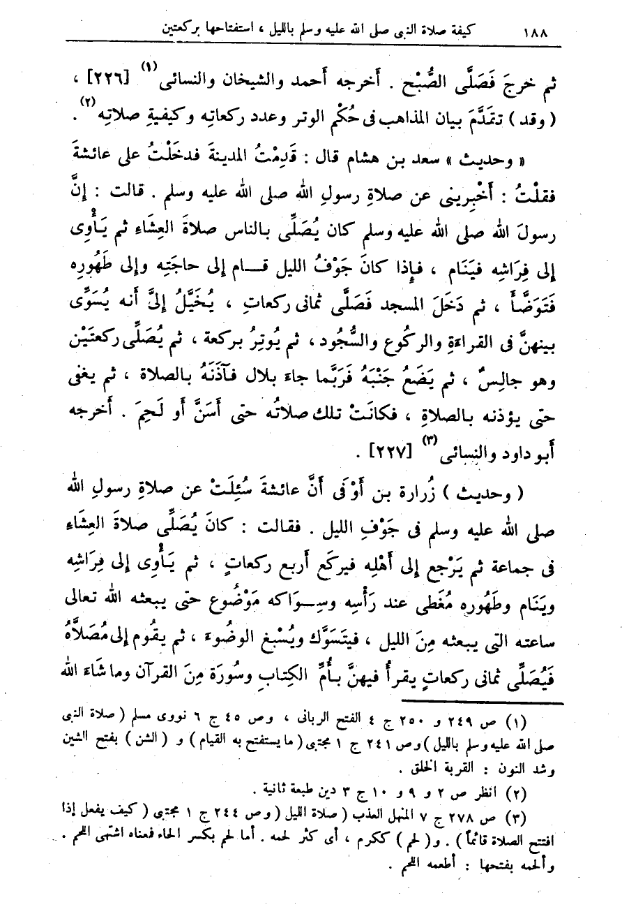 (وحديث) زرارة بن أو في أن عائشة سئلت عن صلاة رسول الله صلى الله عليه وسلم في جوف الليل. فقالت: كان يصلي صلاة العشاء في جماعة ثم يرجع إلى أهله فيركع أربع ركعات، ثم يأوي إلى فراشه وينام وطهوره مغطى عند رأسه وسواكه موضوع حتى يبعثه الله تعالى ساعته التي يبعثه من الليل، فيتسوك ويسبغ الوضوء، ثم يقوم الى مصلاة فيصلي ثماني ركعات يقرأ فيهن بأم الكتاب وسورة من القرآن وما شاء الله