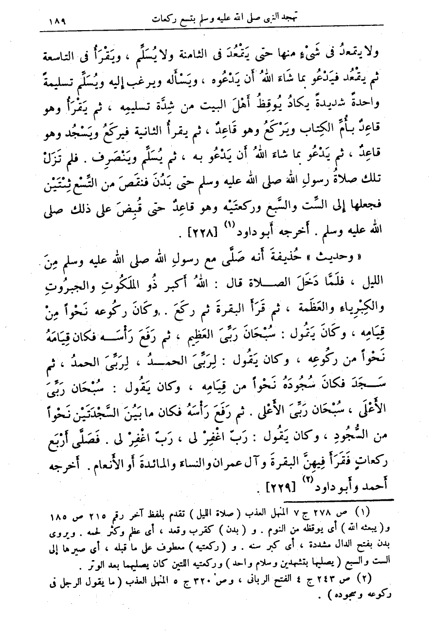 "وحديث" حذيفة أنه صلى مع رسول الله صلى الله عليه وسلم من الليل، فلما دخل الصلاة قال: الله أكبر ذو الملكوت والجبروت والكبرياء والعظمة، ثم قرأ البقرة ثم ركع. وكان ركوعه نحواً من قيامه، وكان يقول: سبحان ربي العظيم، ثم رفع رأسه فكان قيامه نحواً من ركوعه، وكان يقول: لربي الحمد، لربي الحمد، ثم سجد فكان سجوده نحواً من قيامه، وكان يقول: سبحان ربي الأعلى، سبحان ربي الأعلى. ثم رفع رأسه فكان ما بين السجدتين نحواً من السجود، وكان يقول: رب اغفر لي، رب اغفر لي. فصلى أربع ركعات فقرأ فيهن البقرة وآل عمران والنساء والمائدة أو الأنعام. أخرجه أحمد وأبو داود (¬2) [229]