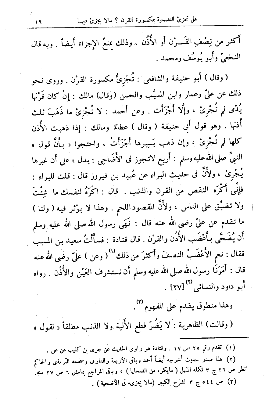 (وقال) أَبو حنيفة والشافعى: تُجْزِئُ مكسورة القْرن. وروى نحو ذلك عن علىّ وعمار وابن المسيَّب والحسن (وقال) مالك: إِنْ كان قَرْنها يُدْمى لم تُجْزِئ، وإِلاَّ أَجْزَأَت. وعن أَحمد: لا تُجْزِئ ما ذَهَبَ ثلث أُذنها. وهو قول أَبى حنيفة (وقال) عطاءُ ومالك: إِذا ذهبت الأُذن كلها لم تُجْزِئ، وإِن ذهب يَسِيرها أَجْزَأَت، واحتجوا " بأَنَّ قول " النبىِّ صلى الله عليه وسلم: أَربع لا تجوز فى الأَضَاحِى " يدل " على أَن غيرها يُجْرِئ، ولأَنَّ فى حديث البراءِ عن عَبيد بن فيروز قال: قلت للبراءِ: فإِنى أَكْرَه النقص من القرن والذنب. قال: اكْرَهُ لنفسك ما شِئُتَ ولا تضيِّق على الناس، ولأَنَّ المقصود اللحم. وهذا لا يؤثر فيه (ولنا) ما تقدم عن علىّ رضى الله عنه قال: نَهَى رسول الله صلى الله عليه وسلم أَن يُضَحَّى بأَعُضَبُ الأُدُن والقرْن. قال قتادة: فسأُلْتُ سعيد بن المسيب فقال: نعم الأَعْضَبُ النصفَ وأَكثرَ من ذلك (¬1) (وعن) علىّ رضى الله عنه قال: أَمَرَنَا رسول الله صلى الله عليه وسلم أَن نستشرف العَيْن والأُذُن. رواه أَبو داود والنسائى (¬2) {27}.