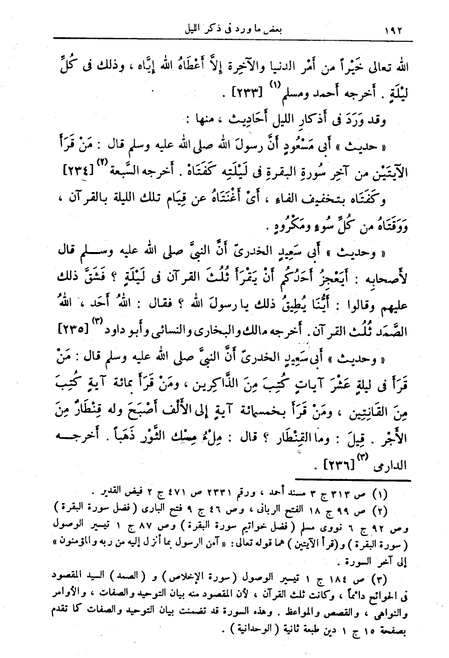 (¬2) ص 99 ج 18 الفتح الرباني، وص 46 ج 9 فتح الباري (فضل سورة البقرة) وص 92 ج 6 نووي مسلم (فضل خواتيم سورة البقرة) وص 87 ج 1 تيسير الوصول (سورة البقرة) و (قرأ الآيتين) هما قوله تعالى: "آمن الرسول بما أنزل إليه من ربه والمؤمنون" إلى آخر السورة.