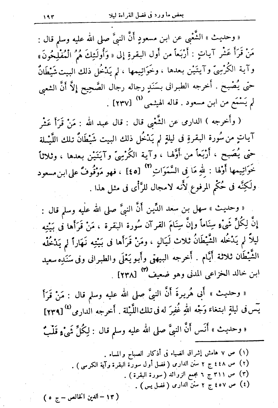 "وحديث" الشعبي عن ابن مسعود أن النبي صلى الله عليه وسلم قال: من قرأ عشر آيات: أربعاً من أول البقرة إلى "وأولئك هم المفلحون" وآية الكرسي وآيتين بعدها، وخواتيمها، لم يدخل ذلك البيت شيطان حتى يصبح. أخرجه الطبراني بسند رجاله رجال الصحيح إلا أن الشعبي لم يسمع من ابن مسعود. قاله الهيثمي (¬1) {237}