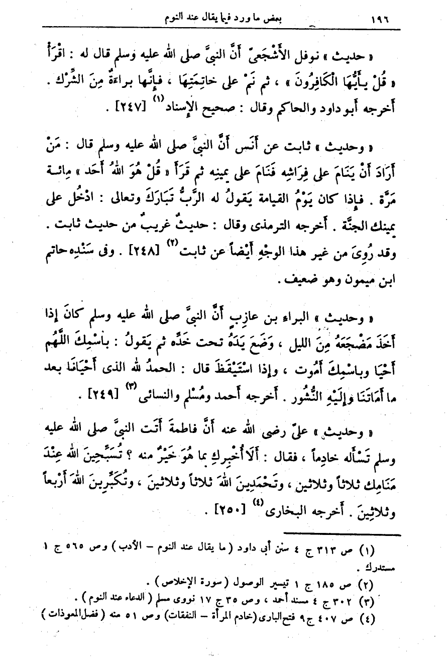 "حديث" نوفل الأشجعي أن النبي صلى الله عليه وسلم قال له: اقرأ "قل يأيها الكافرون"، ثم نم على خاتمتها، فإنها براءة من الشرك. أخرجه أبو داود والحاكم وقال: صحيح الإسناد (¬1) {247}.