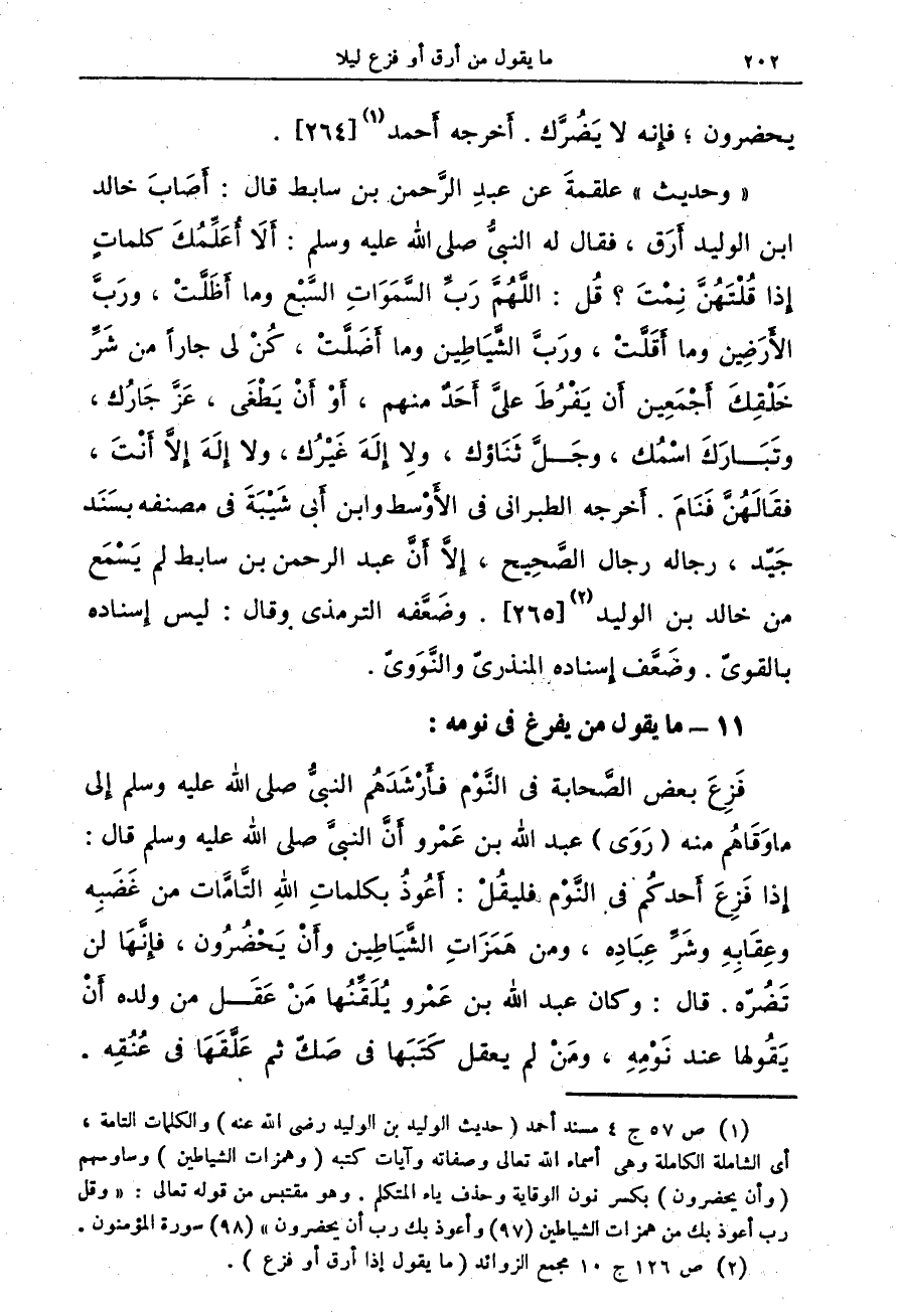"وحديث" علقمة عن عبد الرحمن بن سابط قال: أصاب خالد ابن الوليد أرق، فقال الله النبي صلى الله عليه وسلم: ألا أعلمك كلماتٍ إذا قلتهن نمت؟ قل: اللهم رب السموات السبع وما أظلت، ورب الأرضين وما أقلت، ورب الشياطين وما أضلت، كن لي جاراً من شر خلقك أجمعين أن يفرط عليَّ أحد منهم، أو أن يطغى، عز جارك، وتبارك اسمك، وجل ثناؤك، ولا إله غيرك، ولا إله إلا أنت، فقالهن فنام. أخرجه الطبراني في الأوسط أبي شيبة في مصنفه بسند جيد، رجاله رجال الصحيح، إلا أن عبد الرحمن بن سابط لم يسمع من خالد بن الوليد (¬2) {265}. وضعفه الترمذي وقال: ليس إسناده بالقوي. وضعف إسناده المنذري والنووي.