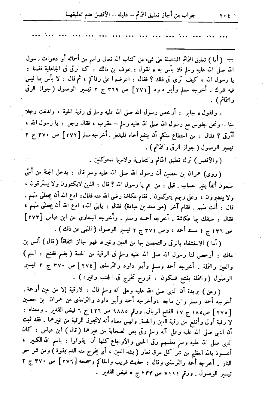"ولقول" جابر: أرخص رسول الله صلى الله عليه وسلم في رقية الحية، ولدغت رجلاً منا- ونحن جلوس مع رسول الله صلى الله عليه وسلم- عقرب، فقال رجل: يا رسول الله، أأرقى؟ فقال: من استطاع منكم ان ينفع أخاه فليفعل. أخرجه مسلم [272] ص 370 ج 2 تيسير الوصول (جواز الرقي والتمائم). (والأفضل) ترك تعليق التمائم والتعاويذ ولاسيما للمتوكلين.