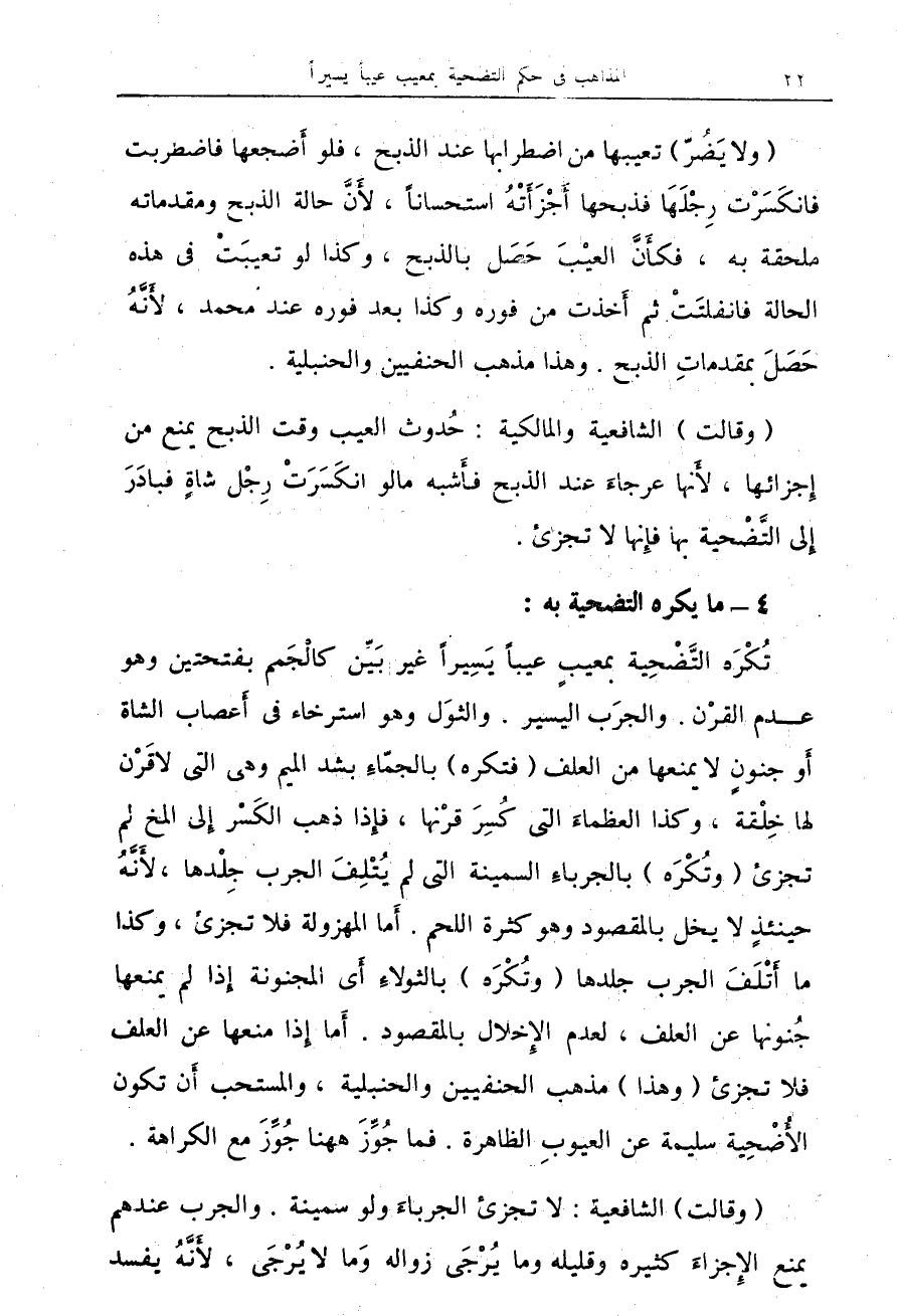(وقالت) الشافعية والمالكية: حُدوث العيب وقت الذبح يمنع من إِجزائها، لأَنها عرجاءَ عند الذبح فأَشبه مالو انكَسَرَت رِجْل شاةٍ فبادَرَ إِلى التَّضْحية بها فإِنها لا تجزئ.