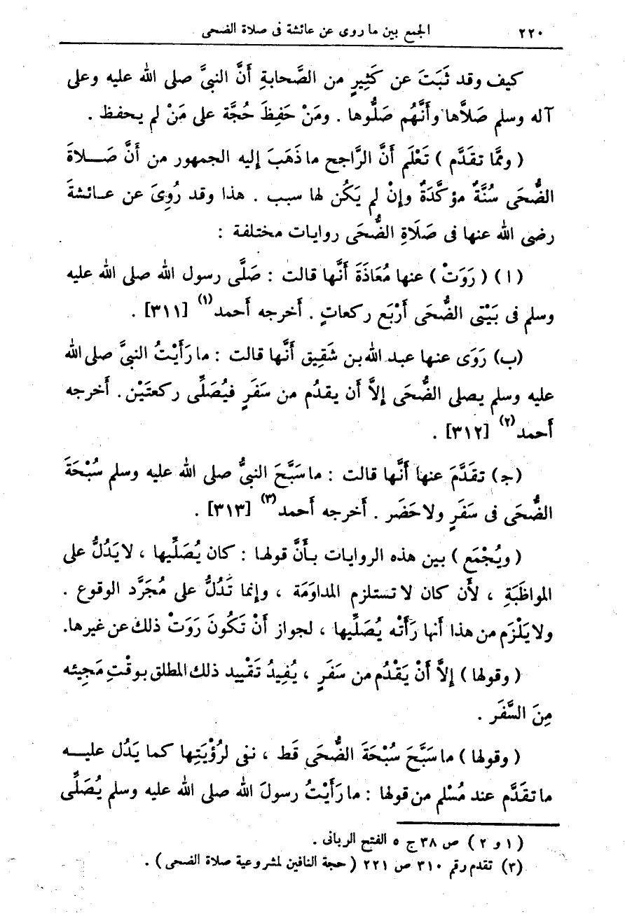 (ومما تقدم) تعلم أن الراجح ما ذهب إليه الجمهور من أن صلاة الضحى سنة مؤكدة وإن لم يكن لها سبب. هذا وقد روي عن عائشة رضي الله عنها في صلاة الضحى روايات مختلفة:
