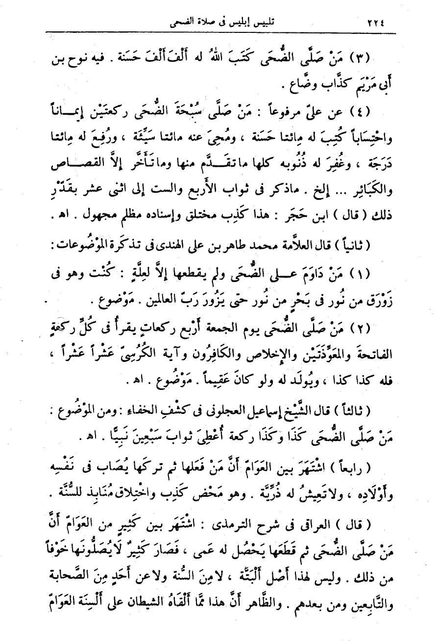 (4) عن عليّ مرفوعاً: من صلى سبحة الضحى ركعتين إيماناً واحتساباً كتب له مائتا حسنة، ومحيَ عنه مائتا سيئة، ورفع له مائتا درجة، وغفر له ذنوبه كلها ما تقدم منها وما تأخر إلا القصاص والكبائر .... الخ. ما ذكر في ثواب الأربع والست إلى اثنى عشر بقدر ذلك (قال) ابن حَجَر: هذا كذب مختلق وإسناده مظلم مجهول. اهـ.