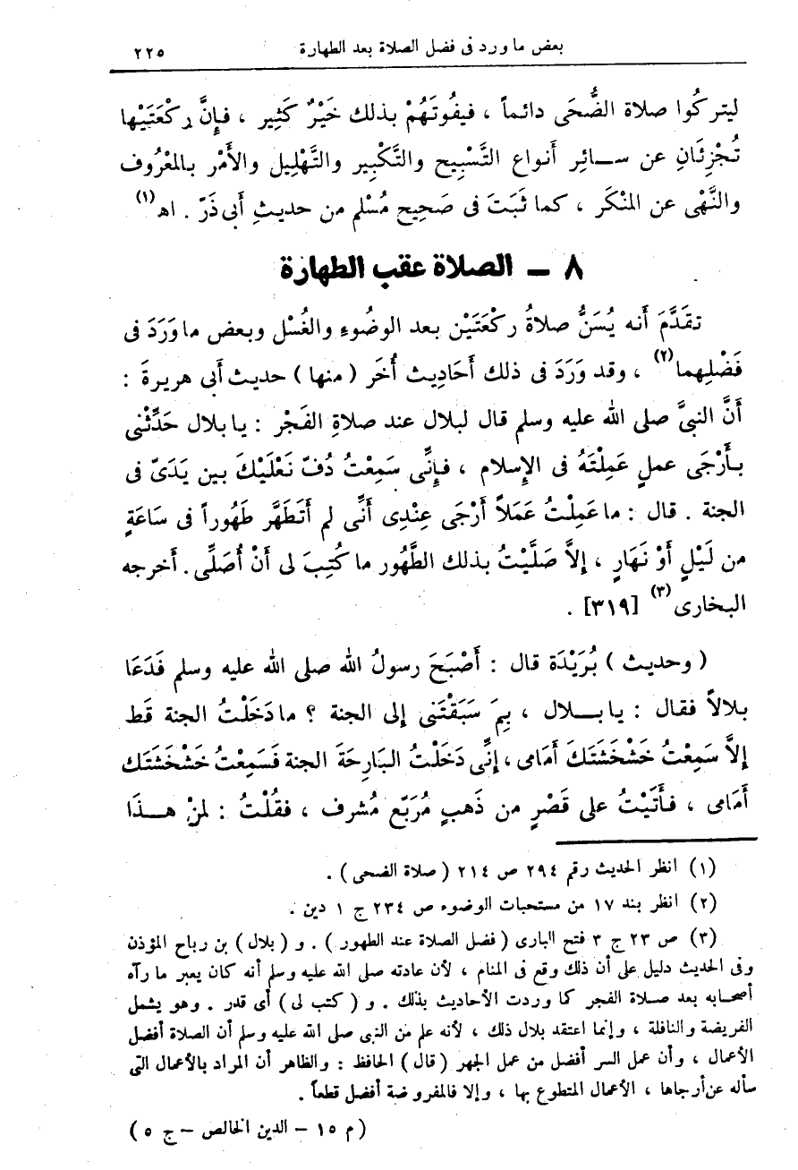 تقدم أنه يسن صلاة ركعتين بعد الوضوء والغسل وبعض ما ورد في فضلهما (¬2)، وقد ورد في ذلك أحاديث أخر (منها) حديث أبي هريرة: أن النبي صلى الله عليه وسلم قال لبلال عند صلاة الفجر: يا بلال حدثني بأرجى عملٍ عملته في الإسلام، فإني سمعتُ دفّ نعليك بين يديّ في الجنة. قال: ما عملتُ عملاً أرجى عندي أني لم أتطهر طهوراً في ساعةٍ من ليلٍ أو نهارٍ، إلا صليت بذلك الطهور ما كتب لي أن أصلي. أخرجه البخاري (¬3) {319}.