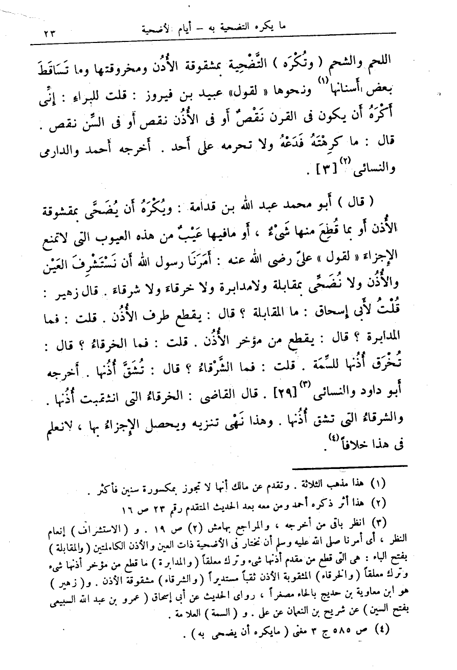 (قال) أَبو محمد عبد الله بن قدامة: ويُكْرَهُ أَن يُضَحَّى بمقشوقة الأُذن أَو بما قُطِعَ منها شَئّْ، أَو ما فيها عَيْبٌ من هذه العيوب التى لا تمنع الإِجزاءَ " لقول " علىّ رضى الله عنه: أَمَرَنَا رسول الله أَن نَسْتَشْرِفَ العَيْن والأُذُن ولا نُضَحَّى بمقابلة ولا مدابرة ولا خرقاءَ ولا شرقاءَ. قال زهير: قُلْتُ لأَبى إِسحاق: ما المقابلة؟ قال: يقطع طرف الأُذُن. قلت: فما المدابرة؟ قال: يقطع من مؤخر الأُذُن. قلت: فما الخرقاءُ؟ قال: تُخْرَق أُذُنها للسِّمة. قلت: فما الشَّرْقاءُ؟ قال: تُشَقَّ أُذُنها. أَخرجه أَبو داود والنسائي (¬3) {29}. قال القاضى: الخرقاءُ التى انثقبت أُذُنها. والشرقاءُ التى تشق أُذُنها. وهذا نَهْى تنزيه ويحصل الإِجزاءُ بها، لا نعلم فى هذا خلافاً (¬4).