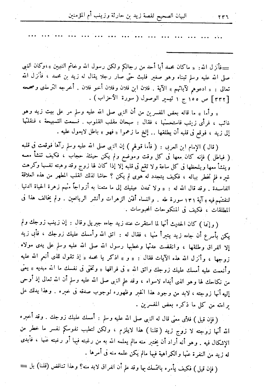 "وأما" ما قاله بعض المفسرين من أن النبي صلى الله عليه وسلم مر على بيت زيد وهو غائب، فرأى زينب فاستحسنها، فقال: سبحان مقلب القلوب. فسمعت التسبيحة، فنقلتها إلى زيد، فوقع في قلبه أن يطلقها .. الخ ما زعموا "فهو" باطل لا يعول عليه.