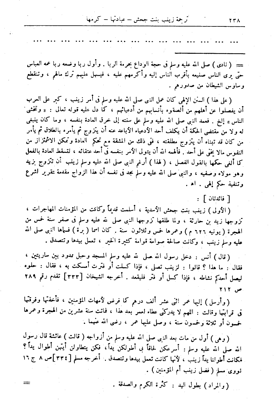 (وهي) أول من مات بعد النبي صلى الله عليه وسلم من أزواجه (قالت) عائشة قال رسول الله صلى الله عليه وسلم: أسرعكن لحاقاً بي أطولكن يداً، فكن يتطاولن أيتهن أطوال يداً؟ فكانت أطوالنا يداً زينب، لأنها كانت تعمل بيدها وتتصدق. أخرجه مسلم [334] ص 8 ج 16 نووي مسلم (فضل زينب أم المؤمنين).
