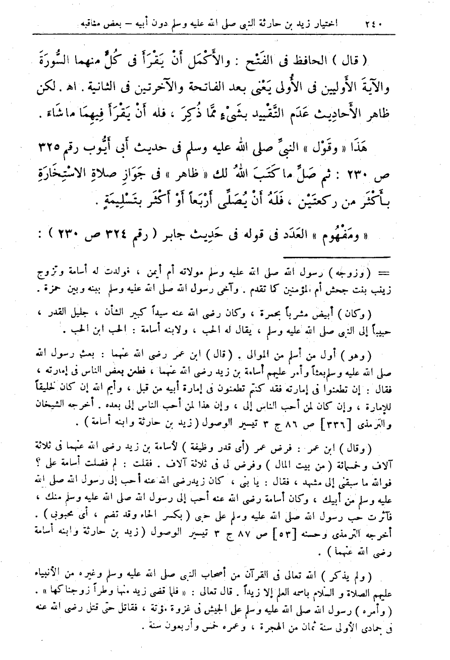 (وقال) ابن عمر: فرض عمر (أي قدر وظيفة) لأسامة بن زيد رضي الله عنهما في ثلاثة آلاف وخمسمائة (من بيت المال) وفرض لي في ثلاثة آلاف. فقلت: لم فضلت أسامة على؟ فوالله ما سبقني إلى مشهد، فقال: يا بني، كان زيد رضي الله عنه احب إلى رسول الله صلى الله عليه وسلم من أبيك، وكان أسامة رضي الله عنه أحب إلى رسول الله صلى الله عليه وسلم منك، فآثرت حب رسول الله صلى الله عليه وسلم على حبي (بكسر الحاء وقد تضم، أي محبوبي). أخرجه الترمذي وحسنه [53] ص 87 ج 3 تيسير الوصول (زيد بن حارثة وابنه أسامة رضي الله عنهما).
