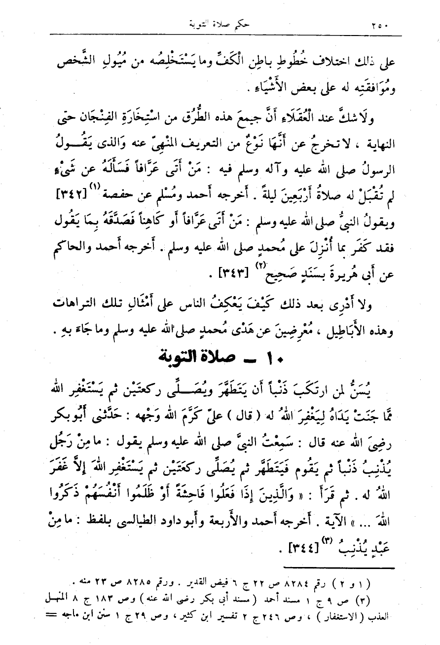يسن لمن ارتكب ذنباً أن يتطهر ويصلي ركعتين ثم يستغفر الله مما جنت يداه ليغفر الله له (قال) عليّ كرم الله وجهه: حدثني أبو بكر رضي الله عنه قال: سمعت النبي صلى الله عليه وسلم يقول: ما من رجل يذنب ذنباً ثم يقوم فيتطهر ثم يصلي ركعتين ثم يستغفر الله إلا غفر الله له. ثم قرأ: "والذين إذا فعلوا فاحشة أو ظلموا أنفسهم ذكروا الله ... " الآية. أخرجه احمد والأربعة وأبو داود الطيالسي بلفظ: ما من عبد يذنب (¬3) [344]