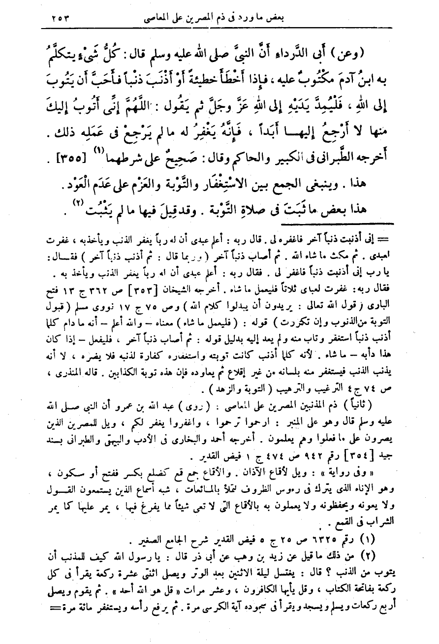 (ثانياً) ذم المذنبين المصرين على المعاصي: (روى) عبد الله بن عمرو أن النبي صلى الله عليه وسلم قال وهو على المنبر: ارحموا ترحموا، واغفروا يغفر لكم، ويل للمصرين الذين يصرون على ما فعلوا وهم يعلمون. أخرجه احمد والبخاري في الادب والبيهقي والطبراني بسند جيد [354] رقم 942 ص 474 ج 1 فيض القدير.
