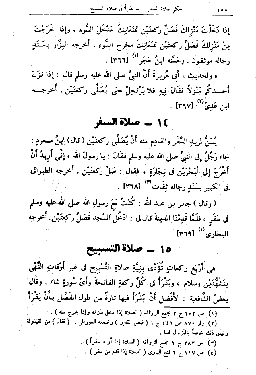 يسن لمريد السفر والقادم منه أن يصلي ركعتين (قال) ابن مسعود: جاء رجل إلى النبي صلى الله عليه وسلم فقال: يا رسول الله، إني أريد أن اخرج إلى البحرين في تجارة، فقال: صل ركعتين. أخرجه الطبراني في الكبير بسند رجاله ثقات (¬3) {368}.