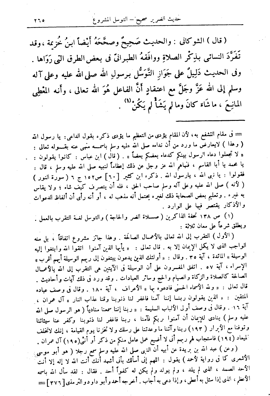 (¬1) ص 138 تحفة الذاكرين (صلاة الضر والحاجة) والتوسل لغة التقرب بالعمل. ويطلق شرعاً على معان ثلاثة: