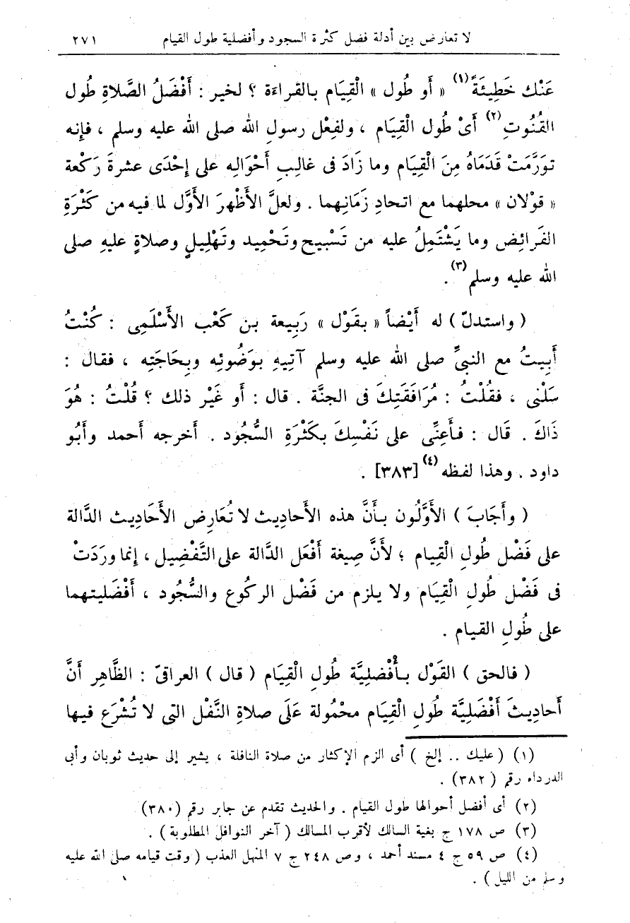 (فالحق) القول بأفضلية طول القيام (قال) العراقي: الظاهر أن أحاديث أفضلية طول القيام محمولة على صلاة النفل التي لا تشرع فيها
