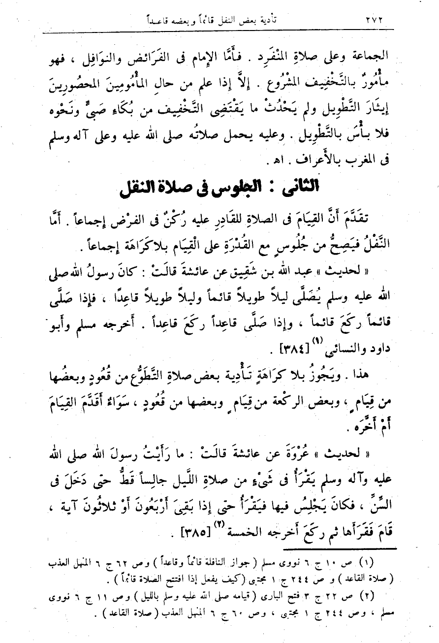 "لحديث" عبد الله بن شقيق عن عائشة قالت: كان رسول الله صلى الله عليه وسلم يصلي ليلاً طويلاً قائماً وليلاً طويلا قاعداً، فإذا صلى قائماً ركع قائماً، وإذا صلى قاعداً ركع قاعداً. أخرجه مسلم وأبو داود والنسائي (¬1) {384}