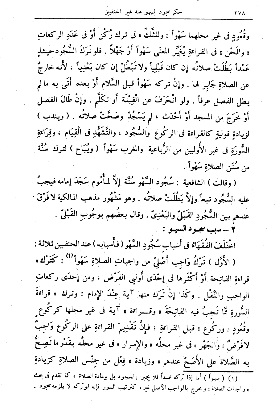 اختلف الفقهاء في أسباب سجود السهو (فأسبابه) عند الحنفيين ثلاثة: (الأول) ترك واجب أصليّ من واجبات الصلاة سهواً (¬1) "كترك" قراءة الفاتحة أو أكثرها في إحدى أولي الفرض، ومن إحدى ركعاتِ الواجب والنفل. وكذا إن ترك منها آية عند الإمام "وترك" قراءة السورة مما تجب فيه الفاتحة "وقراءة" آية في غير محلها كركوعٍ وقعودٍ "وركوع" قبل القراءة؛ فإن تقديم القراءة على الركوع واجبٌ لا فرضٌ "والجهر" في غير محله "والإسرار" في غير محله بقدر ما تصح به الصلاة على الأصح عندهم "وزيادة" فعل من جنس الصلاة كزيادة